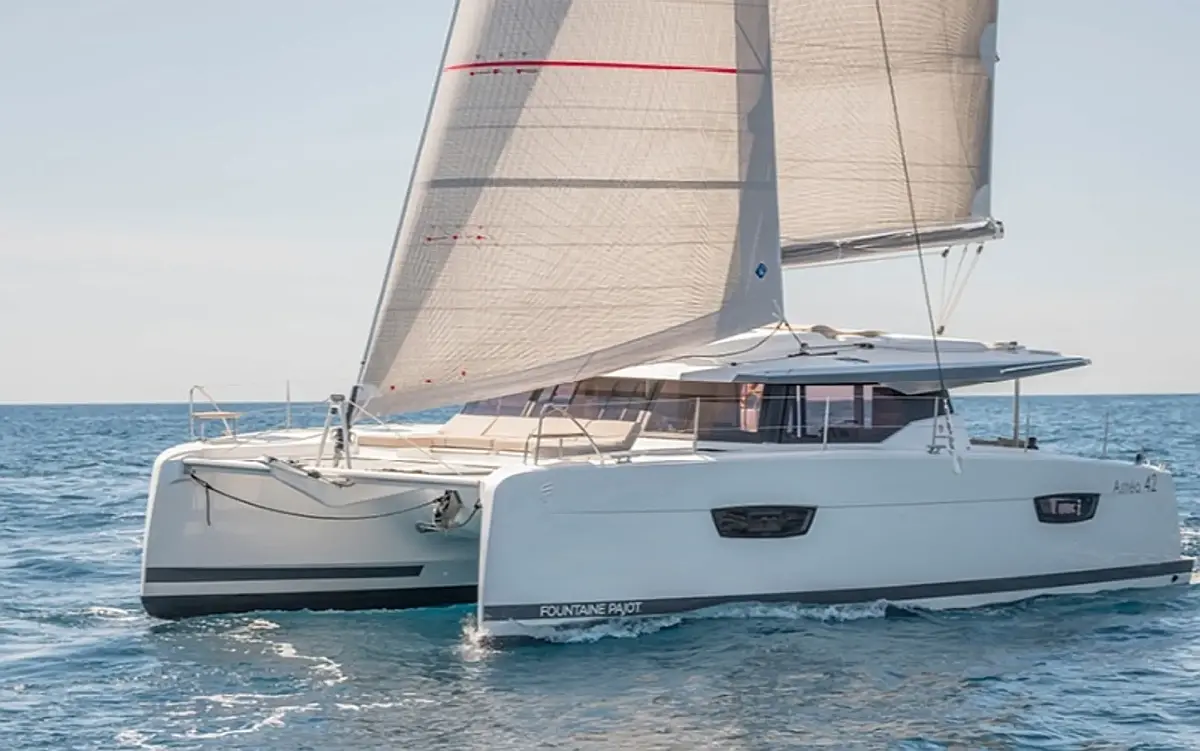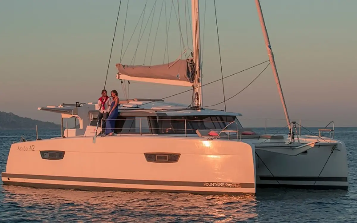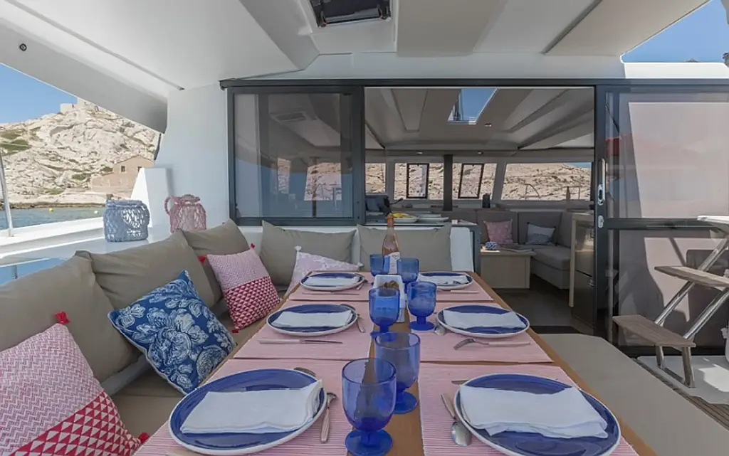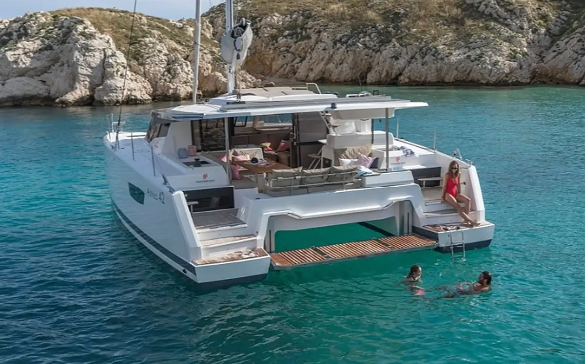 Bimini, Coffee maker, Refrigerator, Electric winches, Generator, Dinghy, Outboard engine, Water maker