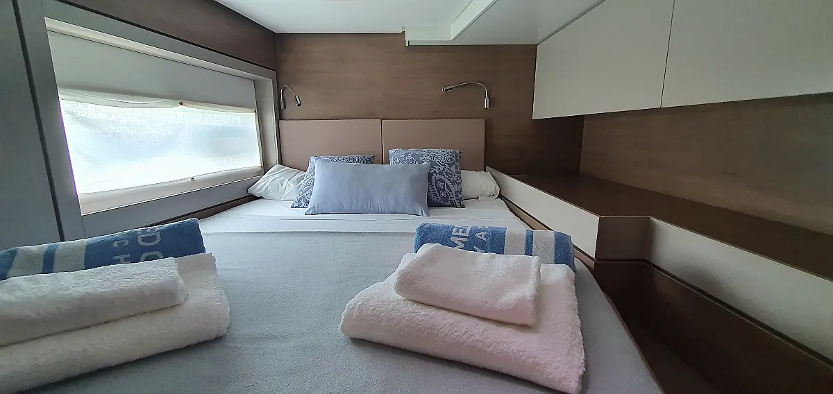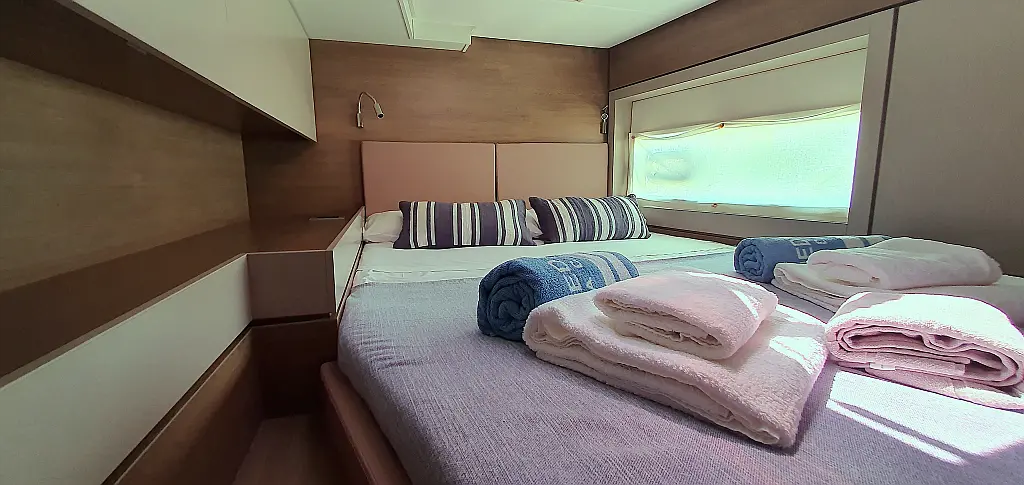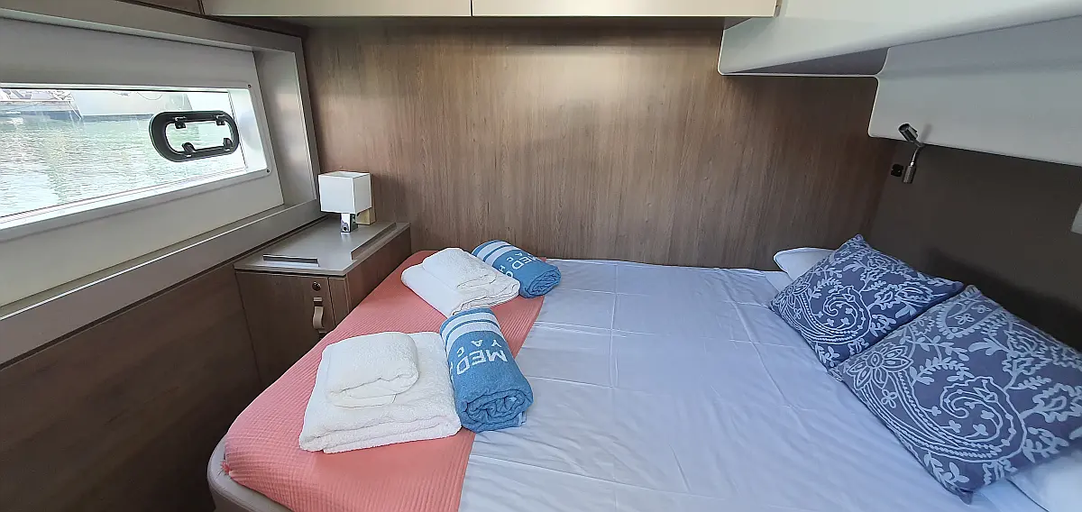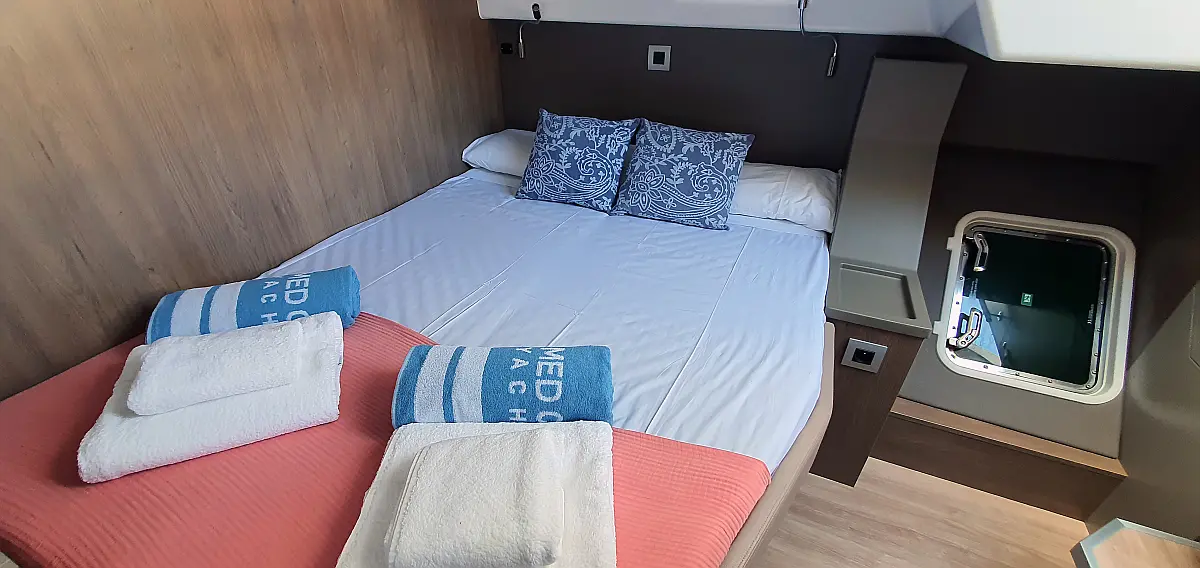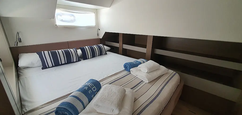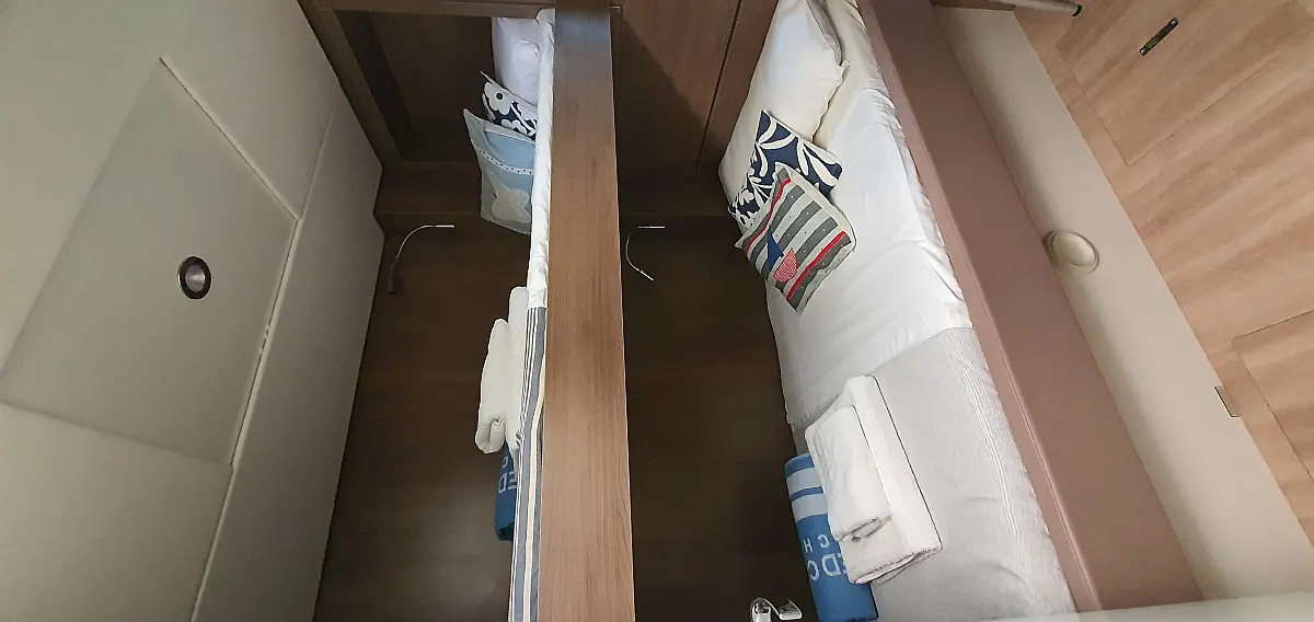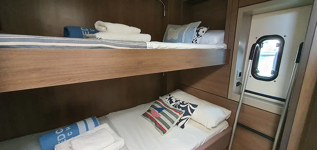 5 GUESTS: 4 double + 1 bunk beds. CREW: 1 front peak + WC to share with guests