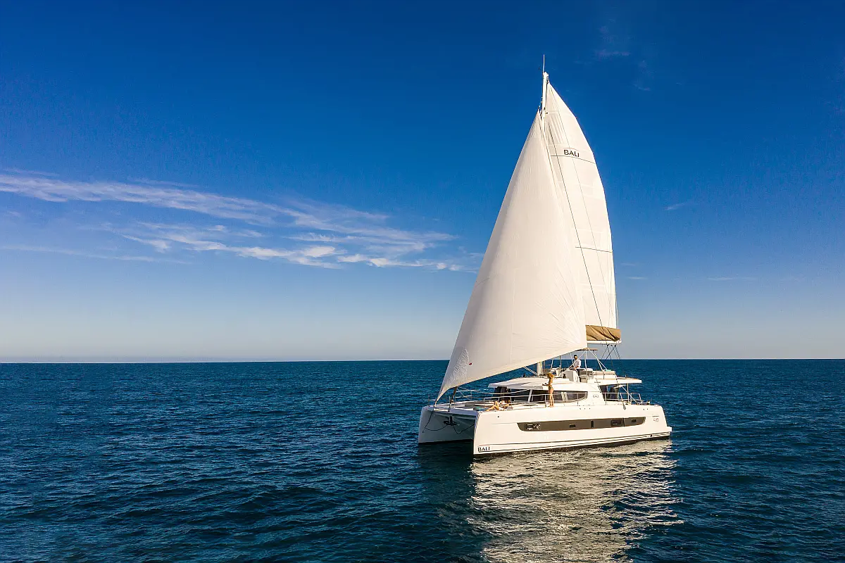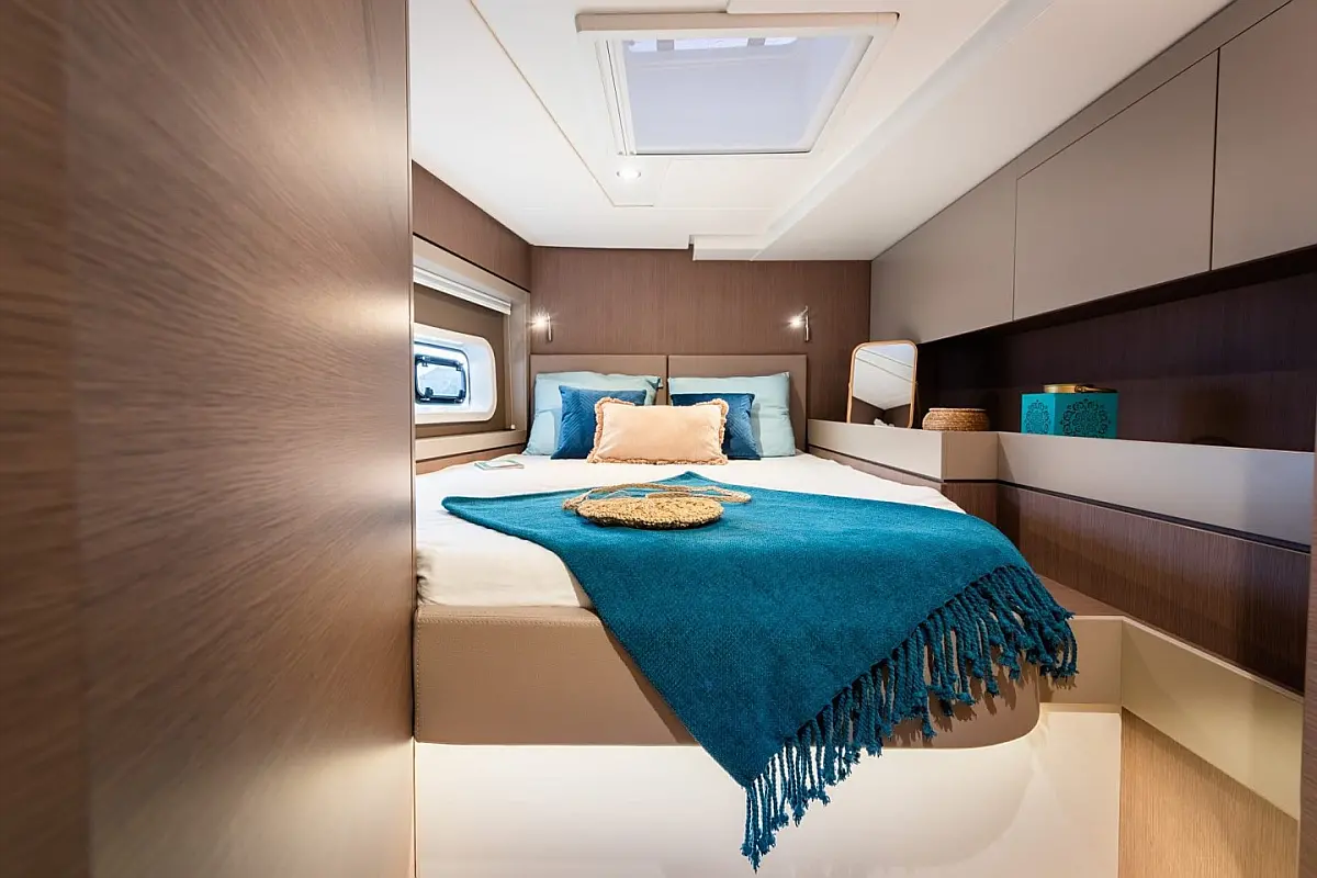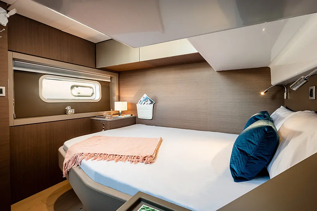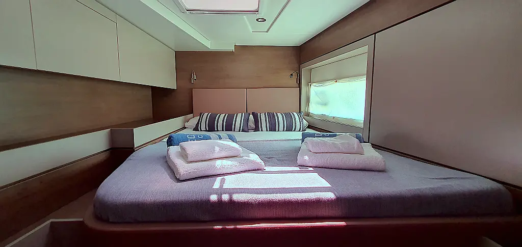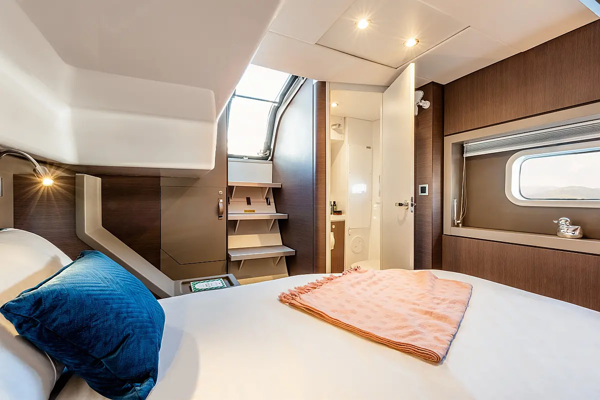 5 GUESTS: 4 double + 1 bunk beds. CREW: 1 front peak + WC to share with guests
