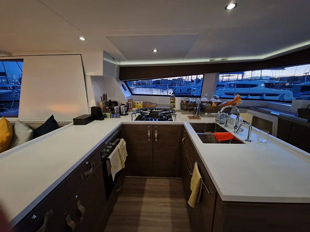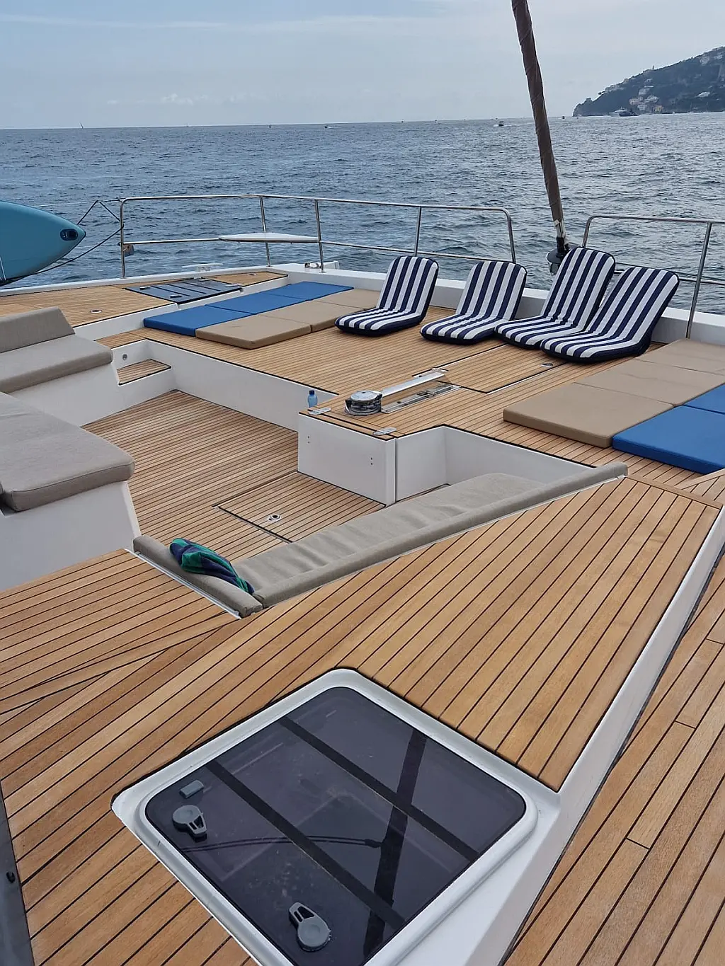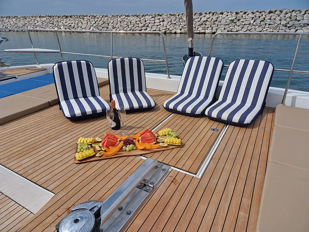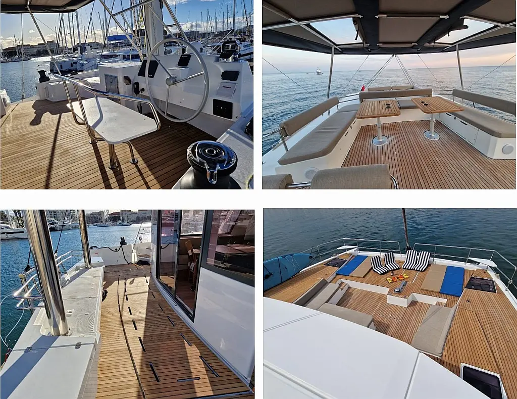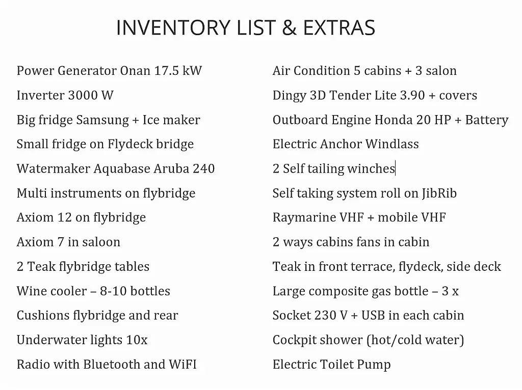 Refrigerator, Dinghy, Generator, Air condition, Water maker, Coffee maker, Teak deck