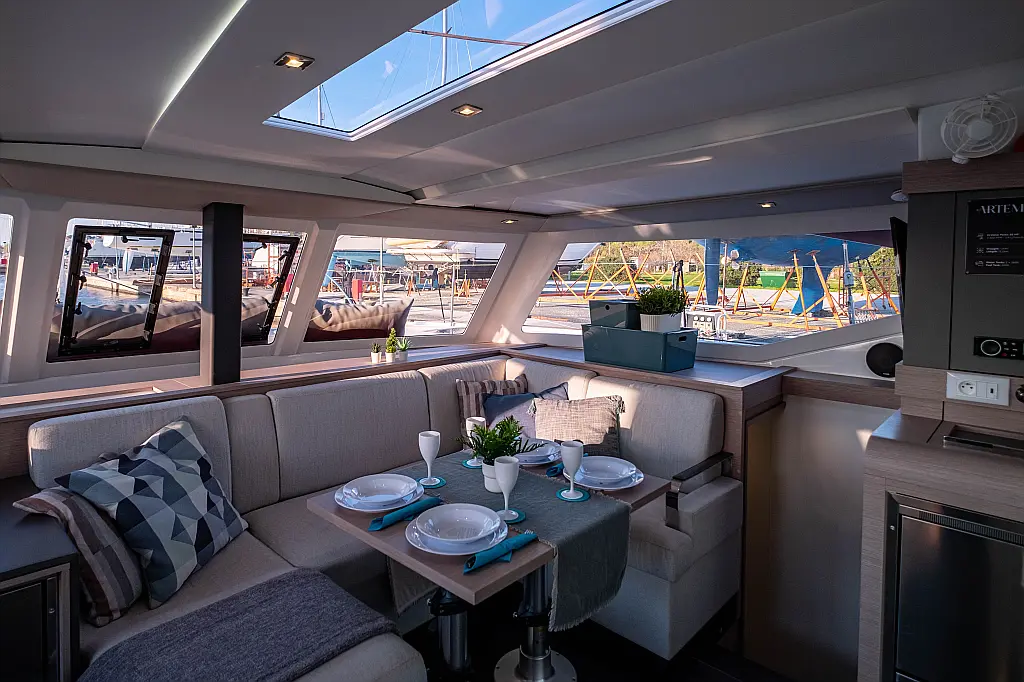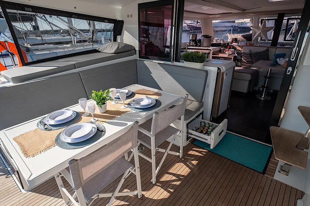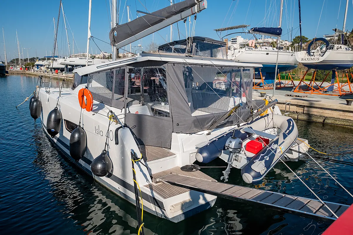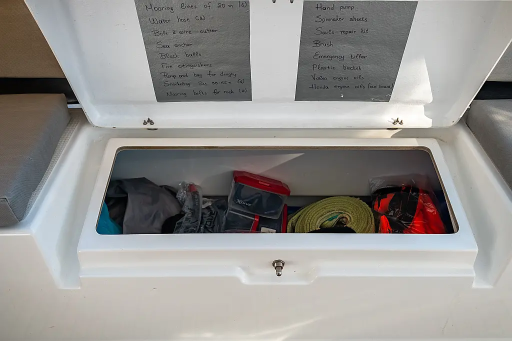 Refrigerator, Cockpit speakers, Electric winches, Dinghy, Air condition, Generator, Inverter, Electric toilet, Solar Panels, Water maker, Outboard engine, Cockpit cushions, Teak Cockpit
