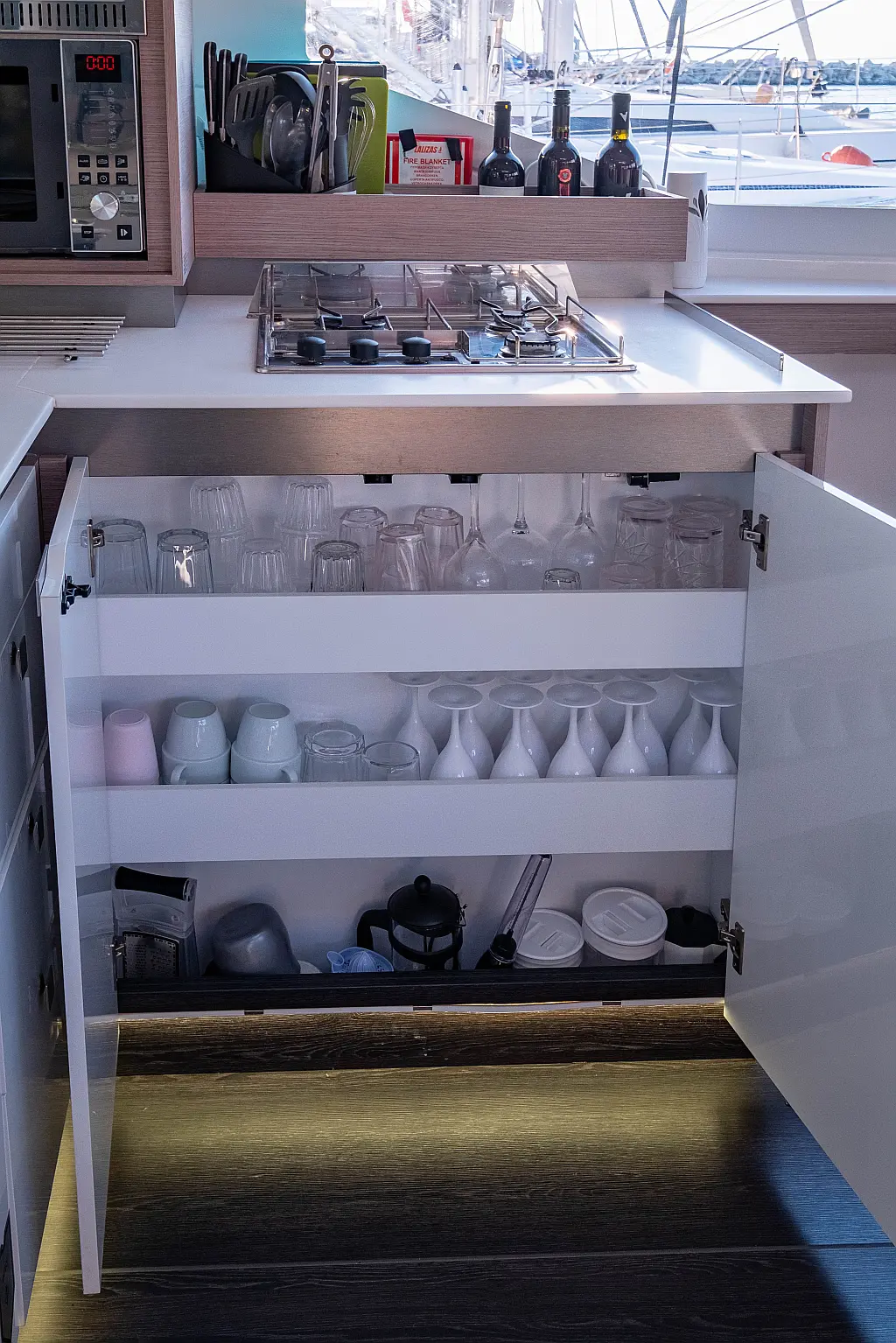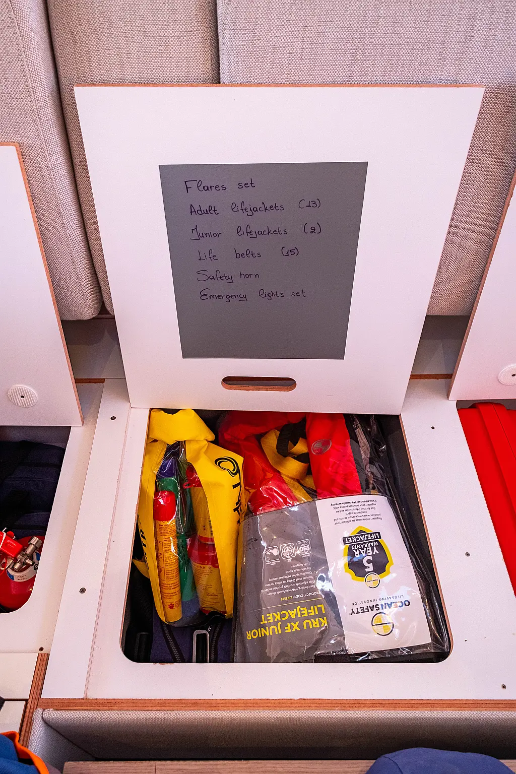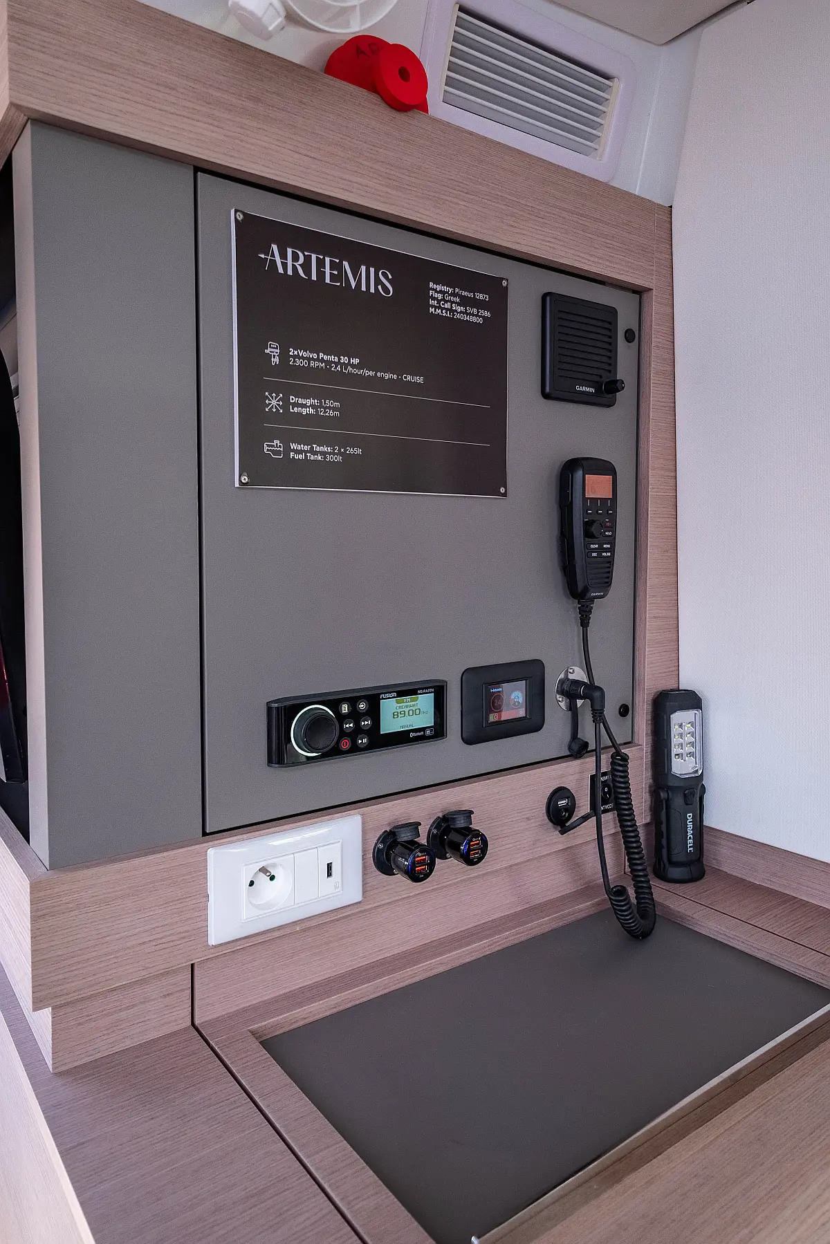 Refrigerator, Cockpit speakers, Electric winches, Dinghy, Air condition, Generator, Inverter, Electric toilet, Solar Panels, Water maker, Outboard engine, Cockpit cushions, Teak Cockpit