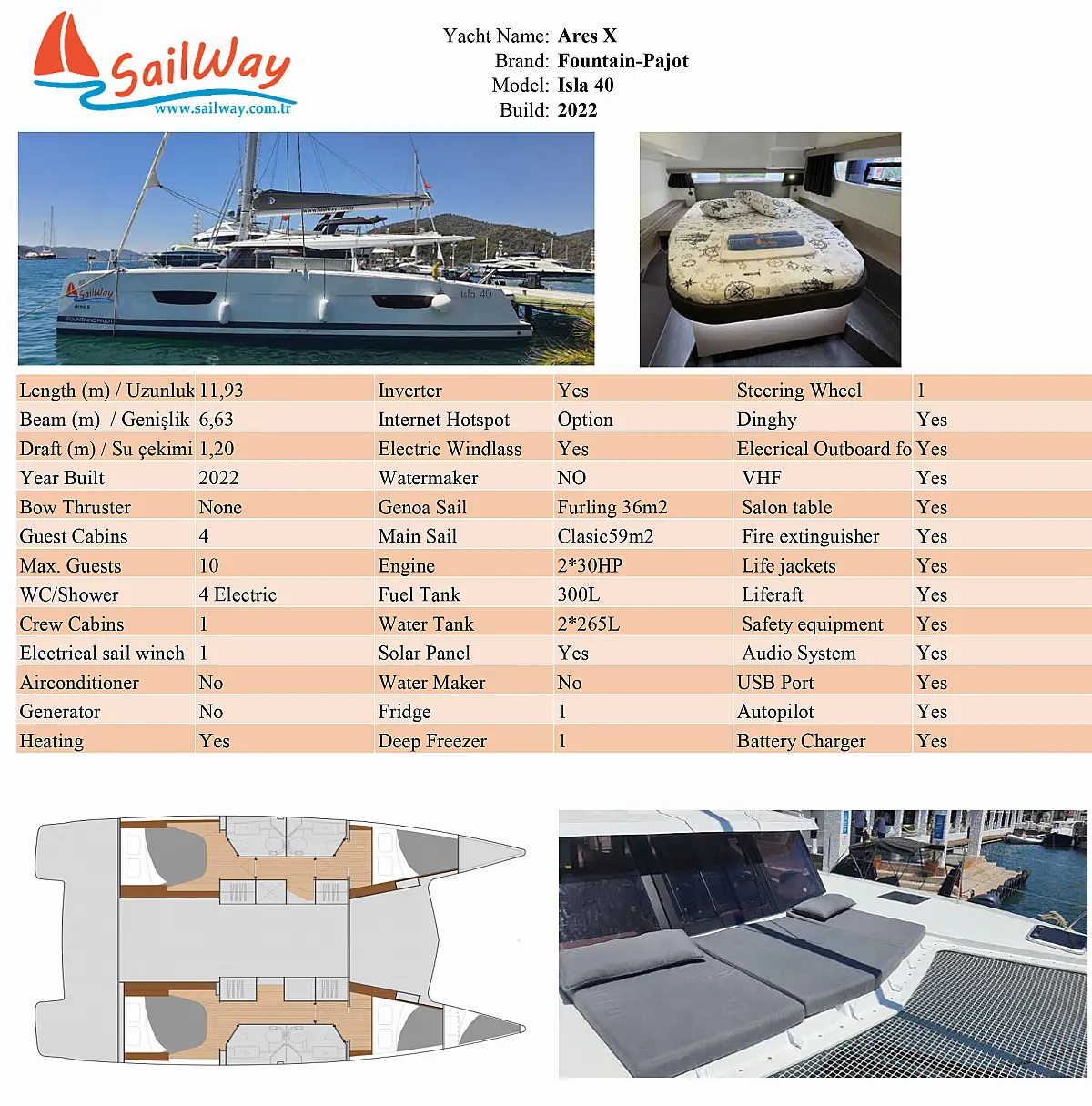 Solar Panels, Refrigerator, Dinghy, Inverter, Electric toilet, Heating, Electric winches
