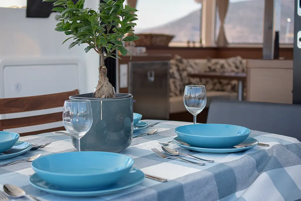 Air condition, Water maker, Electric winches, Electric toilet, Coffee maker, Solar Panels, Generator, Bimini, Cockpit cushions, Sprayhood, Cockpit speakers, Dinghy, Outboard engine, Refrigerator