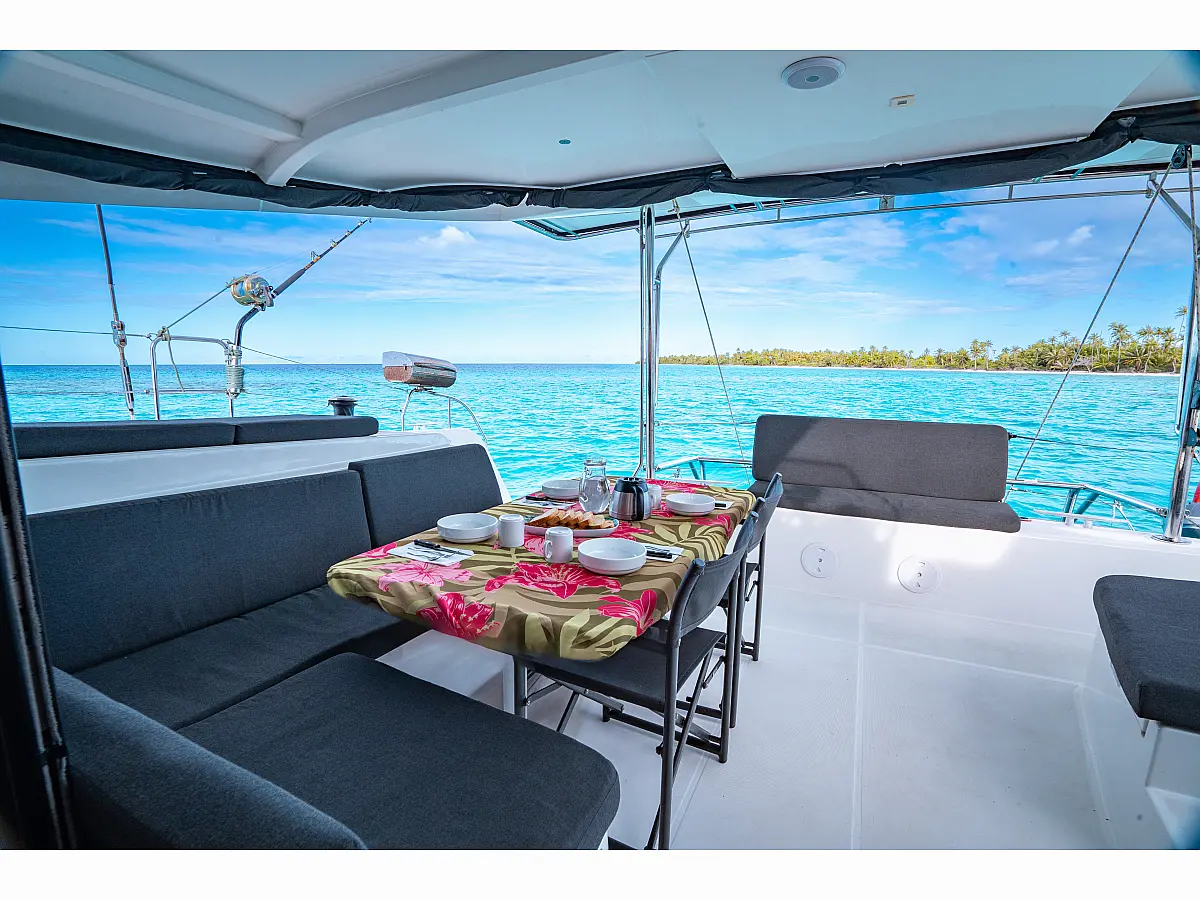 Barbecue grill in cockpit, Bimini, Cockpit cushions, Water maker, Refrigerator, Outboard engine, Solar Panels