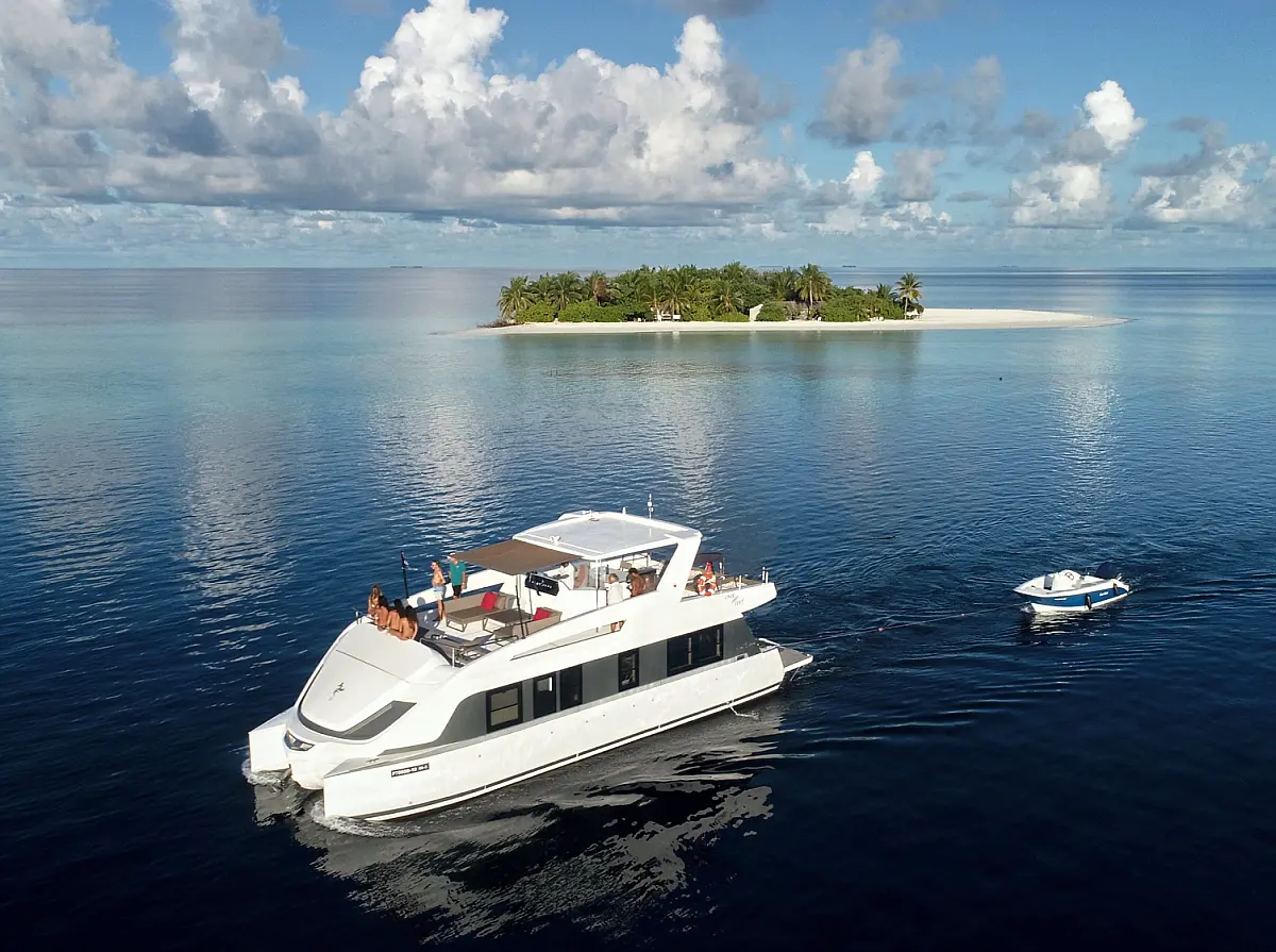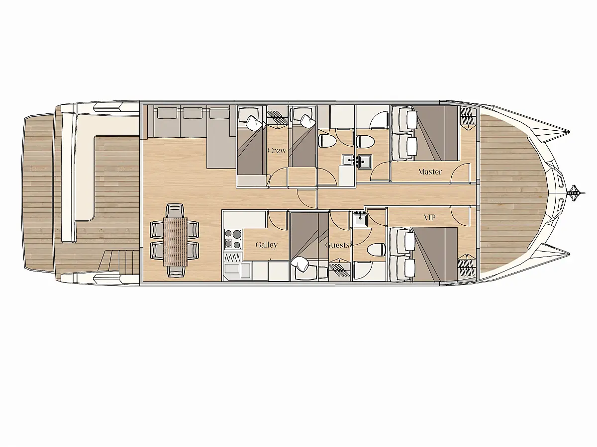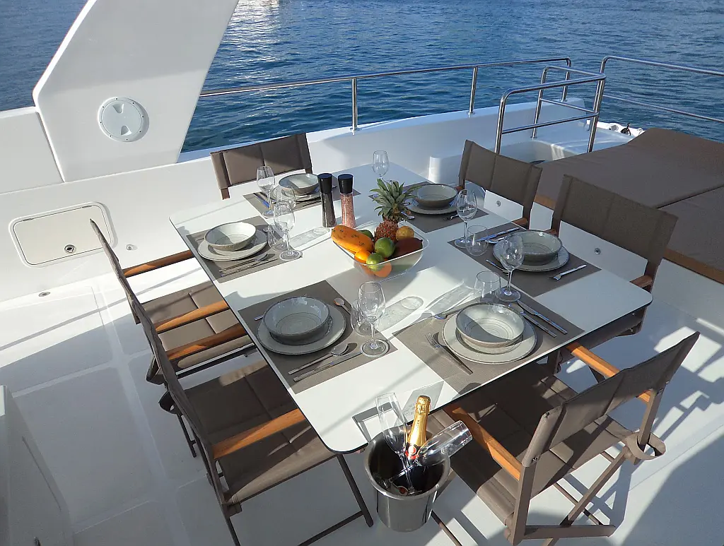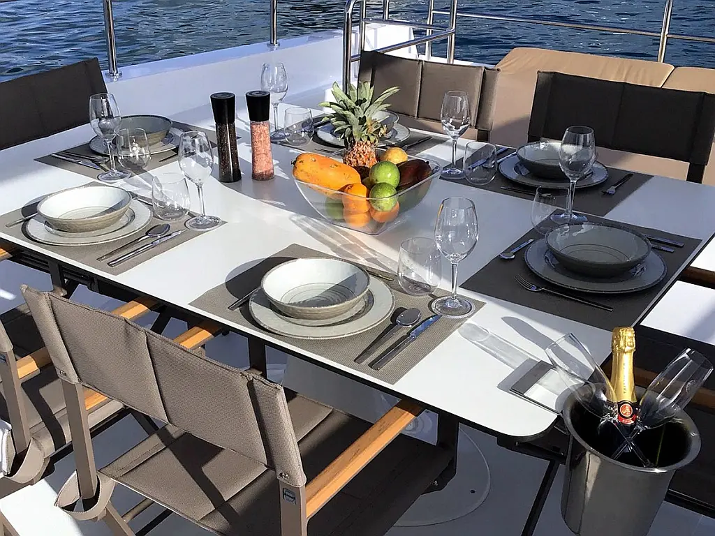 Bimini, Generator, Inverter, Barbecue grill in cockpit, Wi-Fi & Internet, Air condition, Cockpit cushions, Cockpit speakers, Coffee maker, Hydraulic gangway, Dinghy, Solar Panels, Water maker, Swimming platform