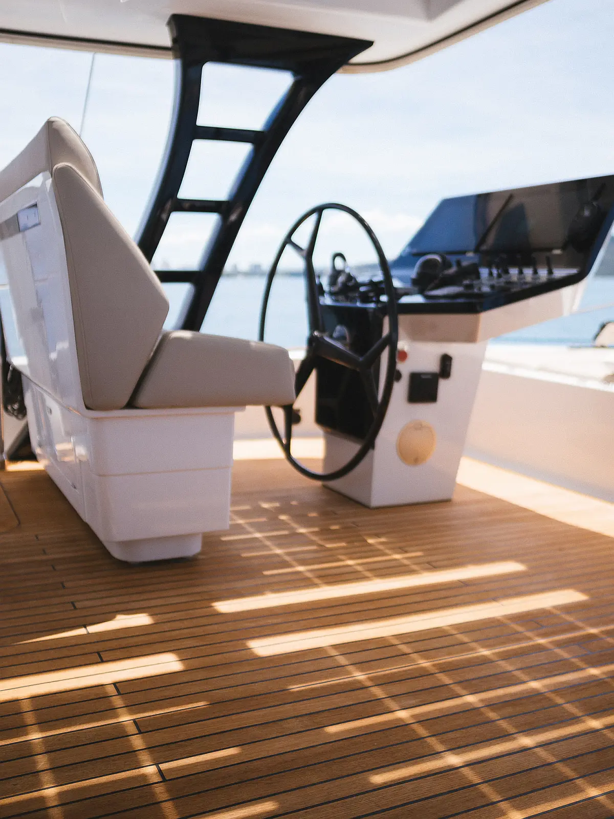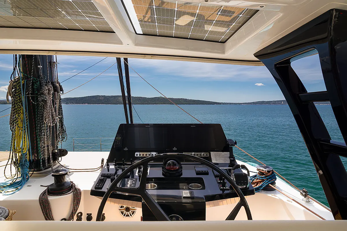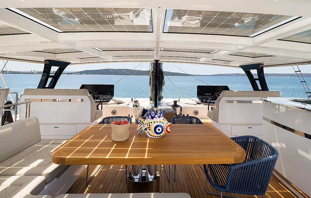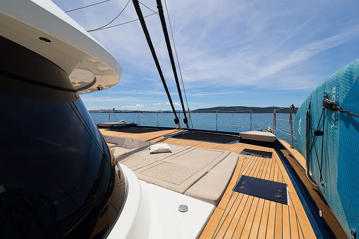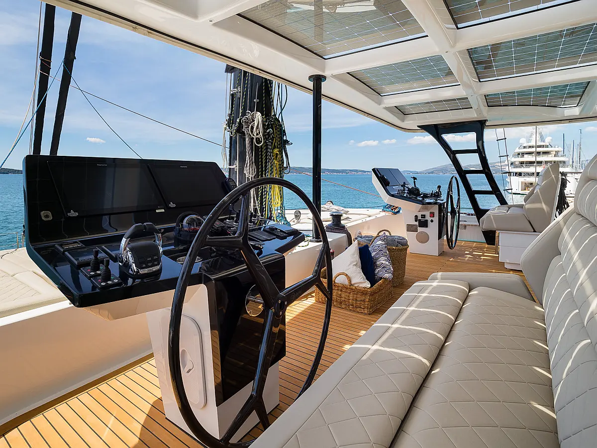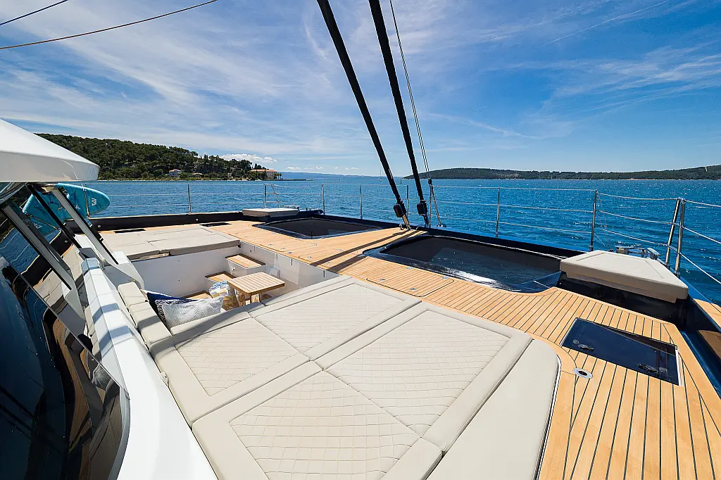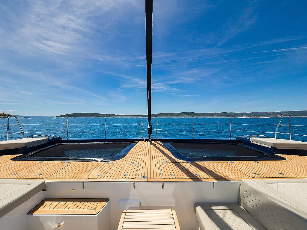 Cockpit speakers, Barbecue grill in cockpit, Air condition, Heating, Swimming platform, Bimini, Teak deck, Refrigerator, Generator, Solar Panels, Outboard engine, Dinghy, Sprayhood