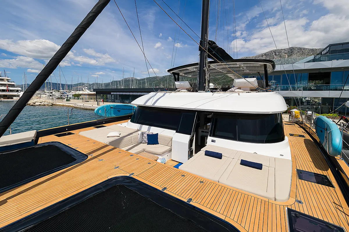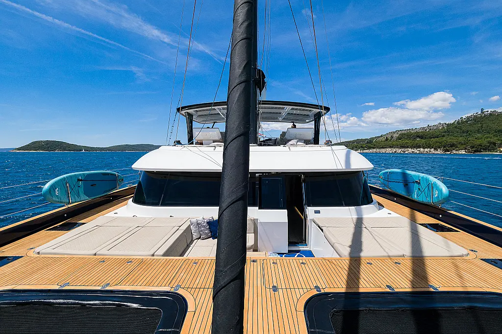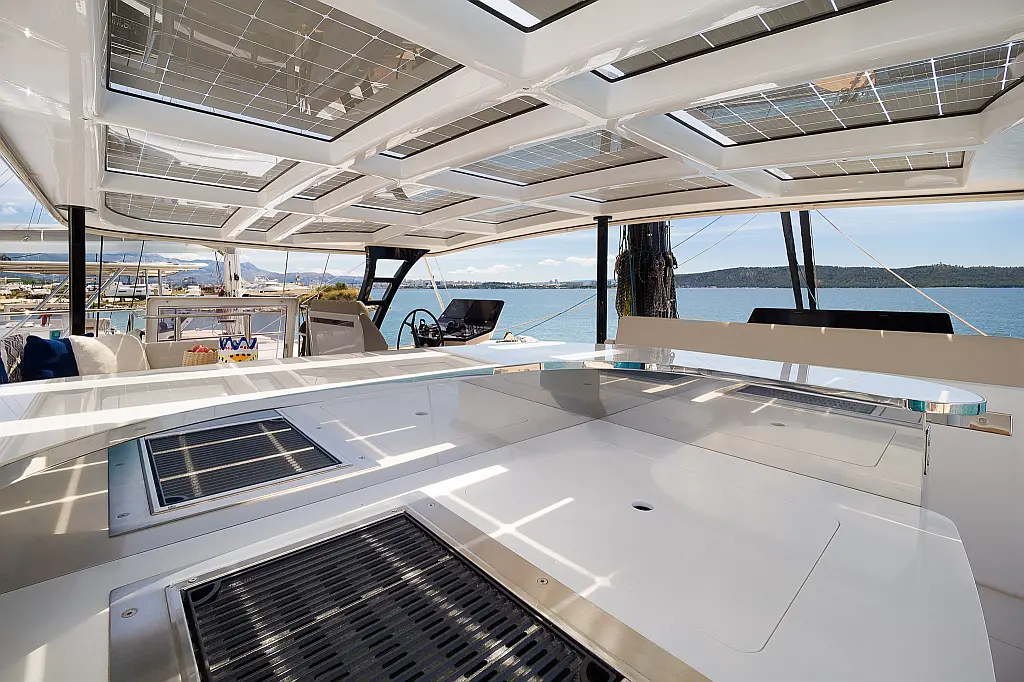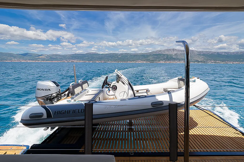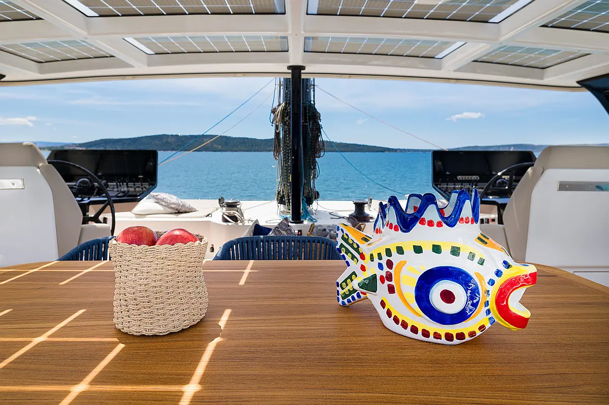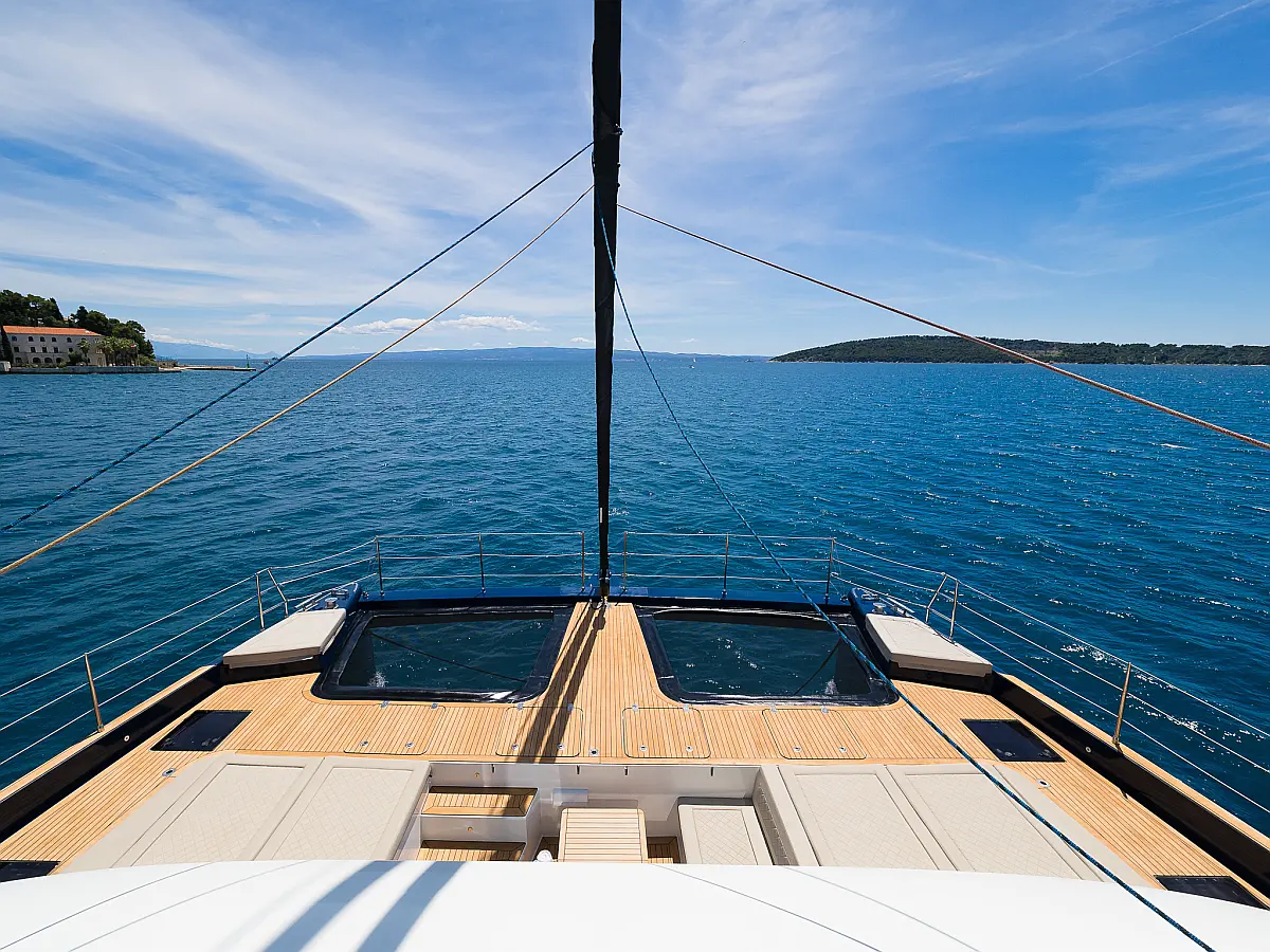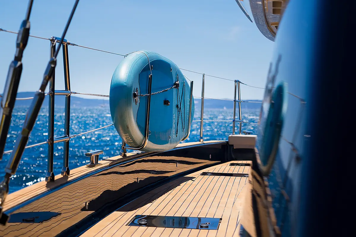 Cockpit speakers, Barbecue grill in cockpit, Air condition, Heating, Swimming platform, Bimini, Teak deck, Refrigerator, Generator, Solar Panels, Outboard engine, Dinghy, Sprayhood