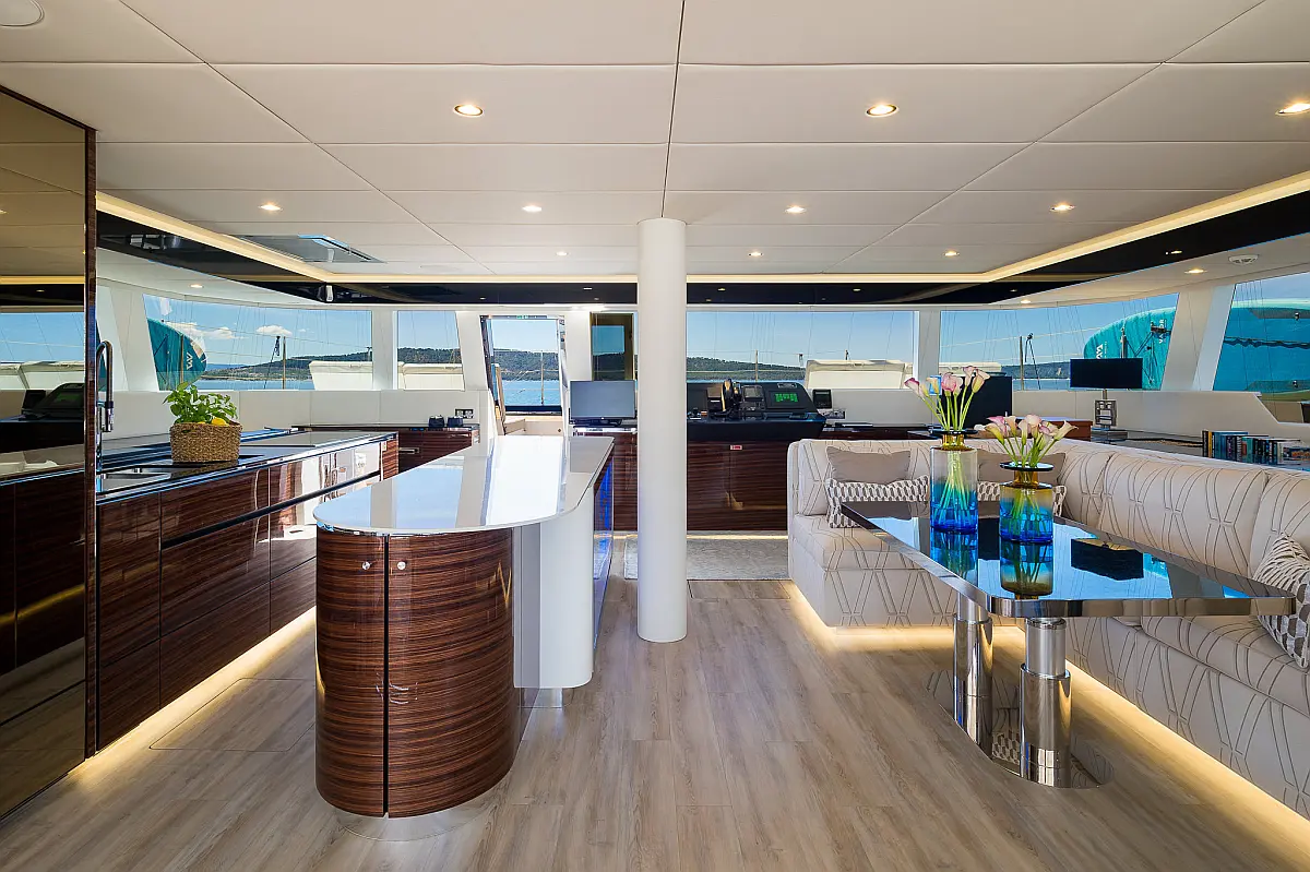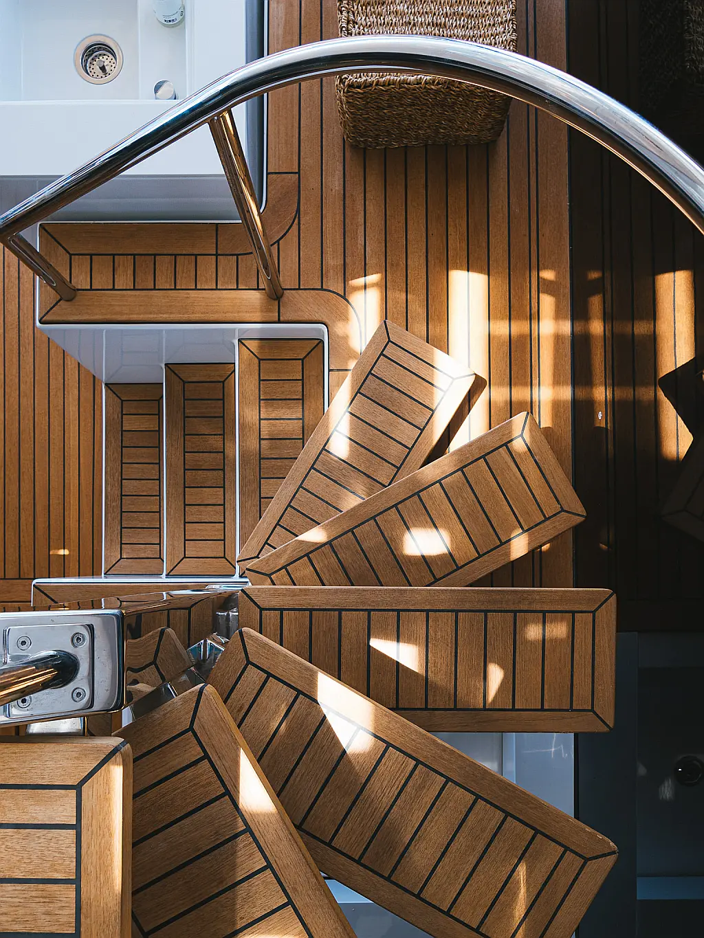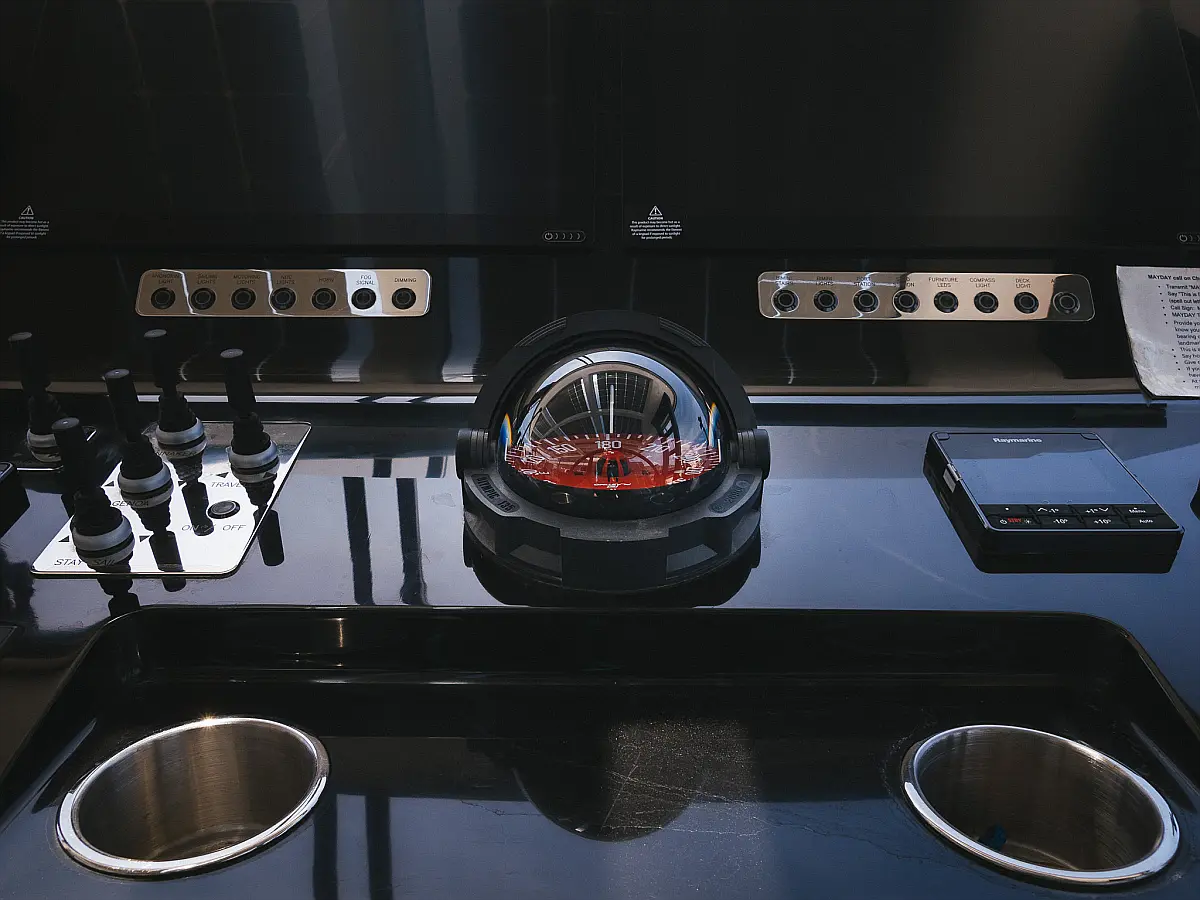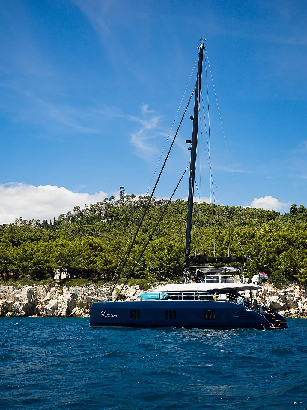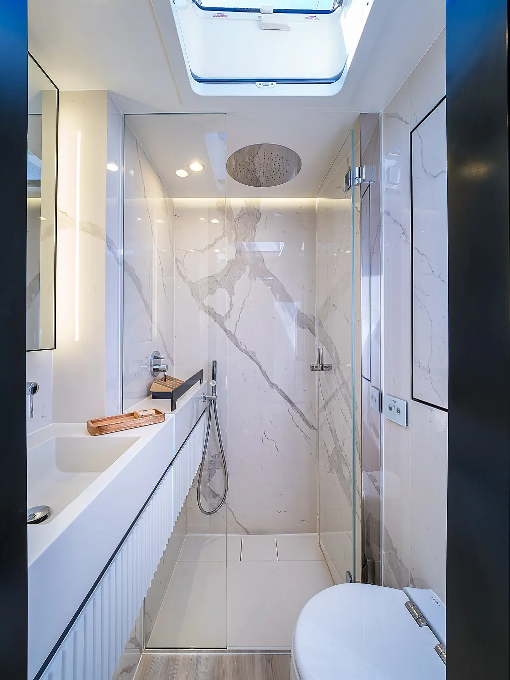 Cockpit speakers, Barbecue grill in cockpit, Air condition, Heating, Swimming platform, Bimini, Teak deck, Refrigerator, Generator, Solar Panels, Outboard engine, Dinghy, Sprayhood