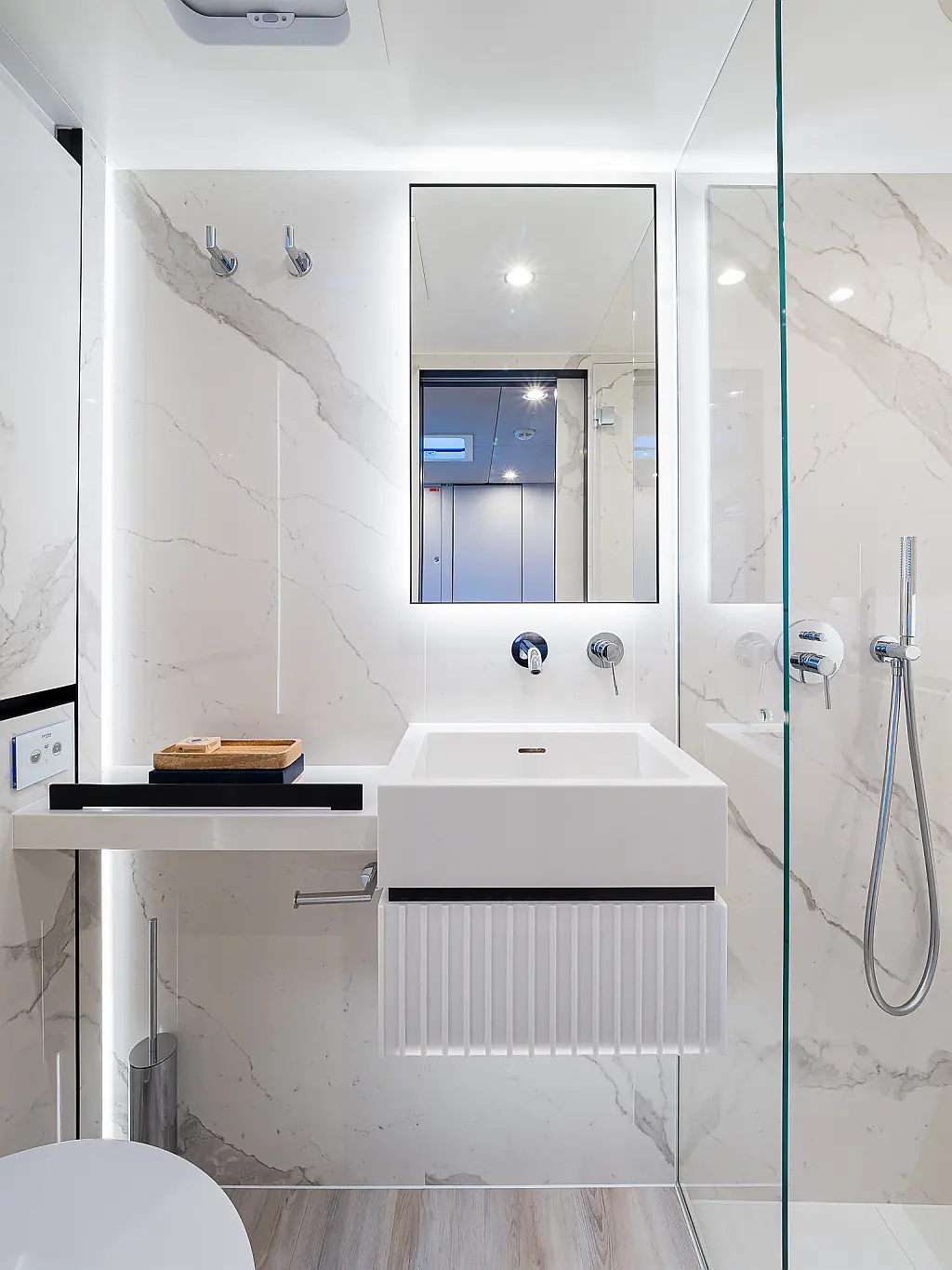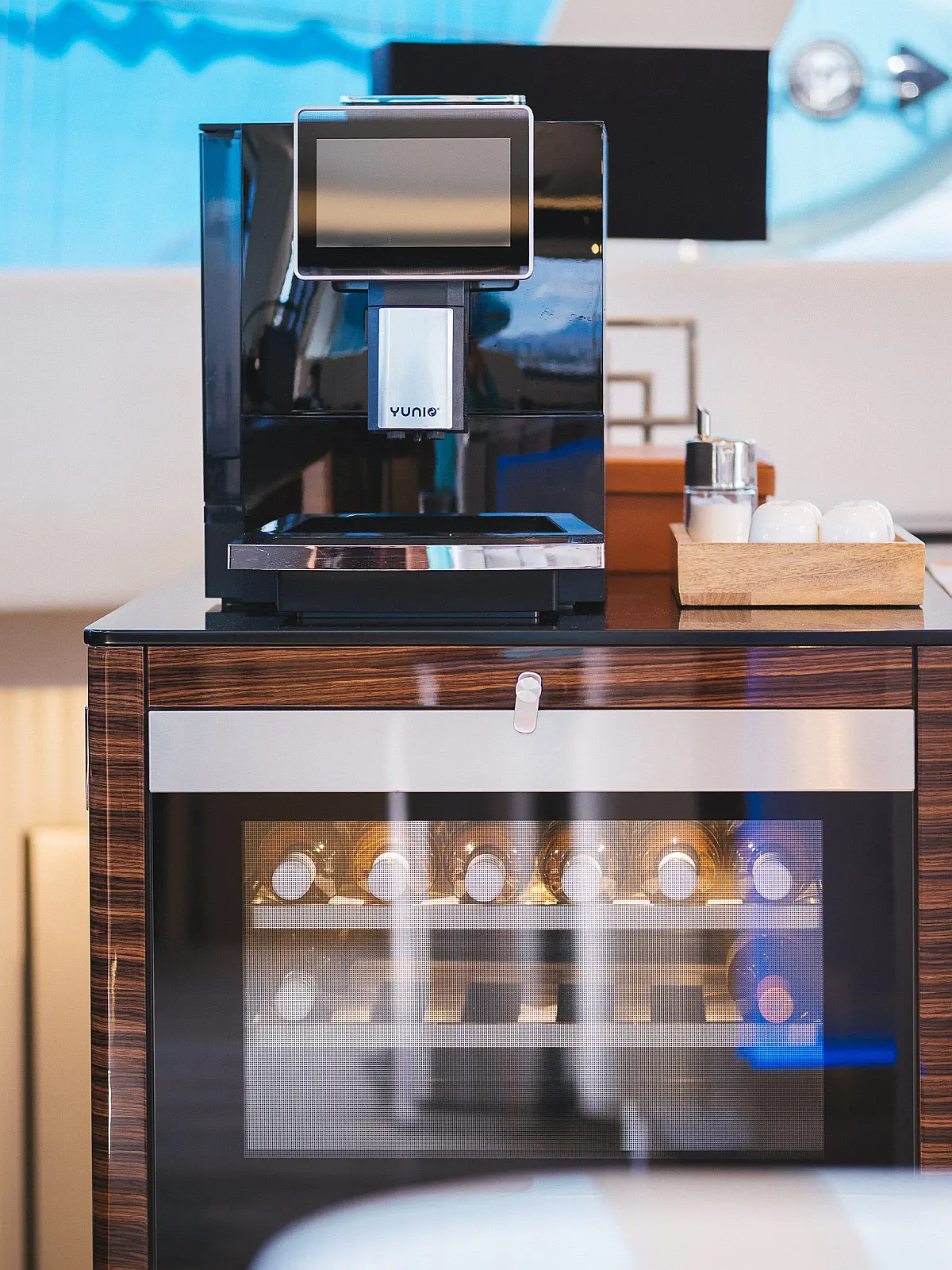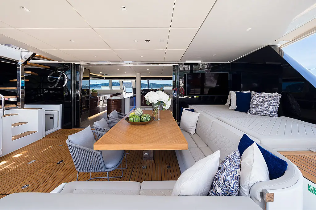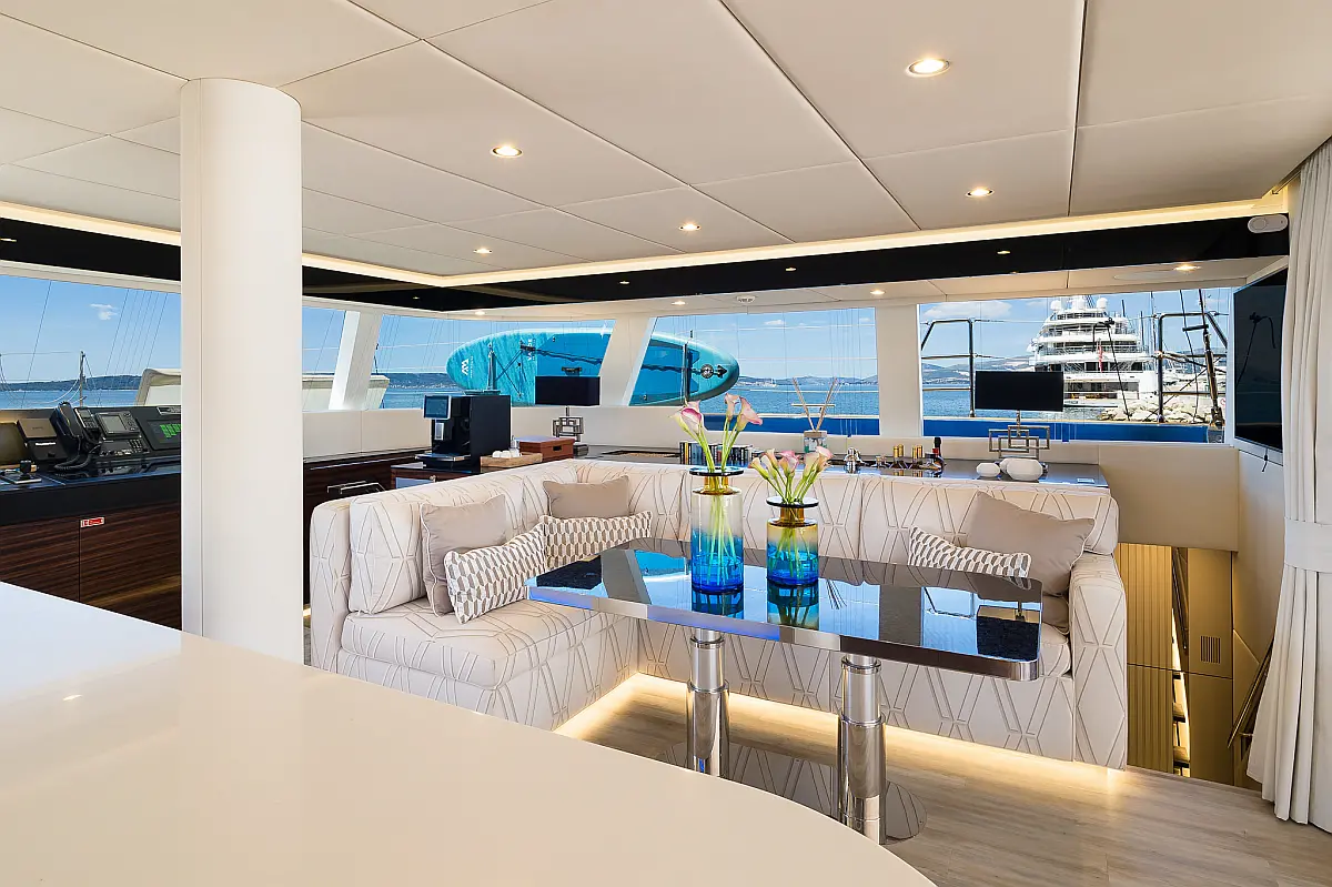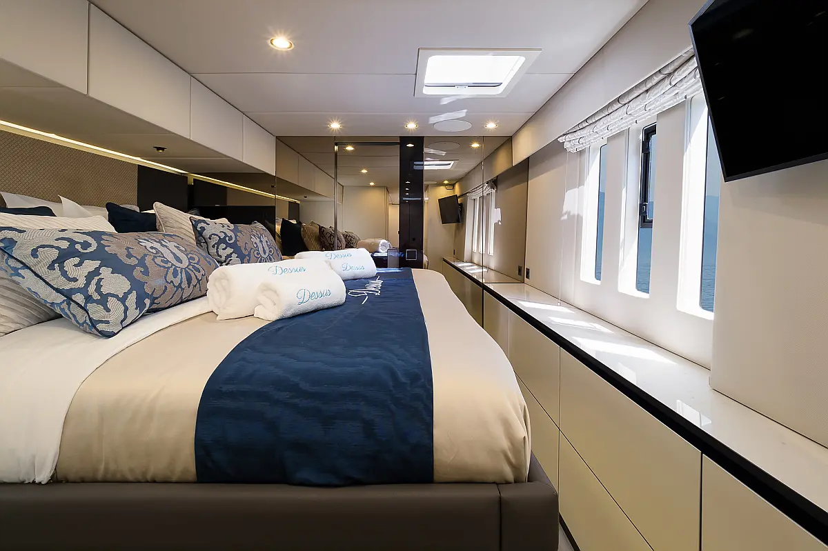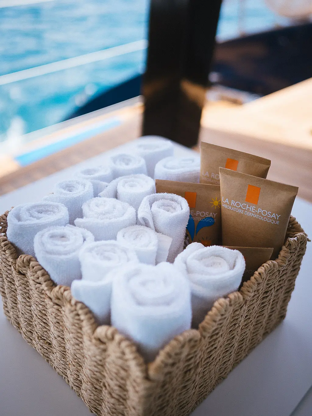 Cockpit speakers, Barbecue grill in cockpit, Air condition, Heating, Swimming platform, Bimini, Teak deck, Refrigerator, Generator, Solar Panels, Outboard engine, Dinghy, Sprayhood