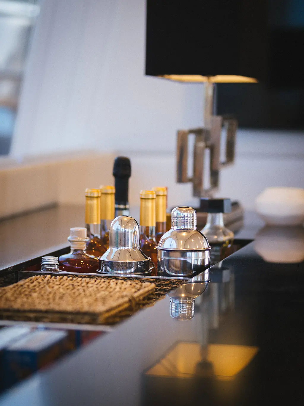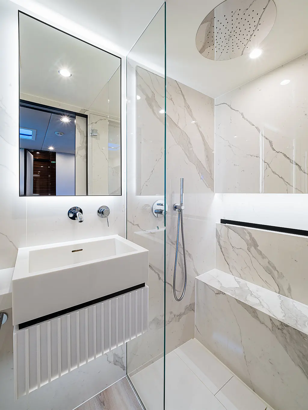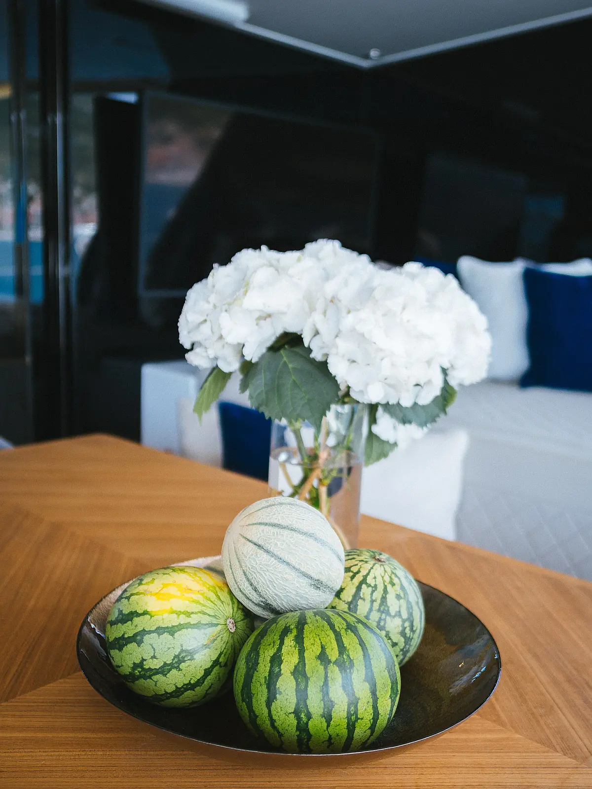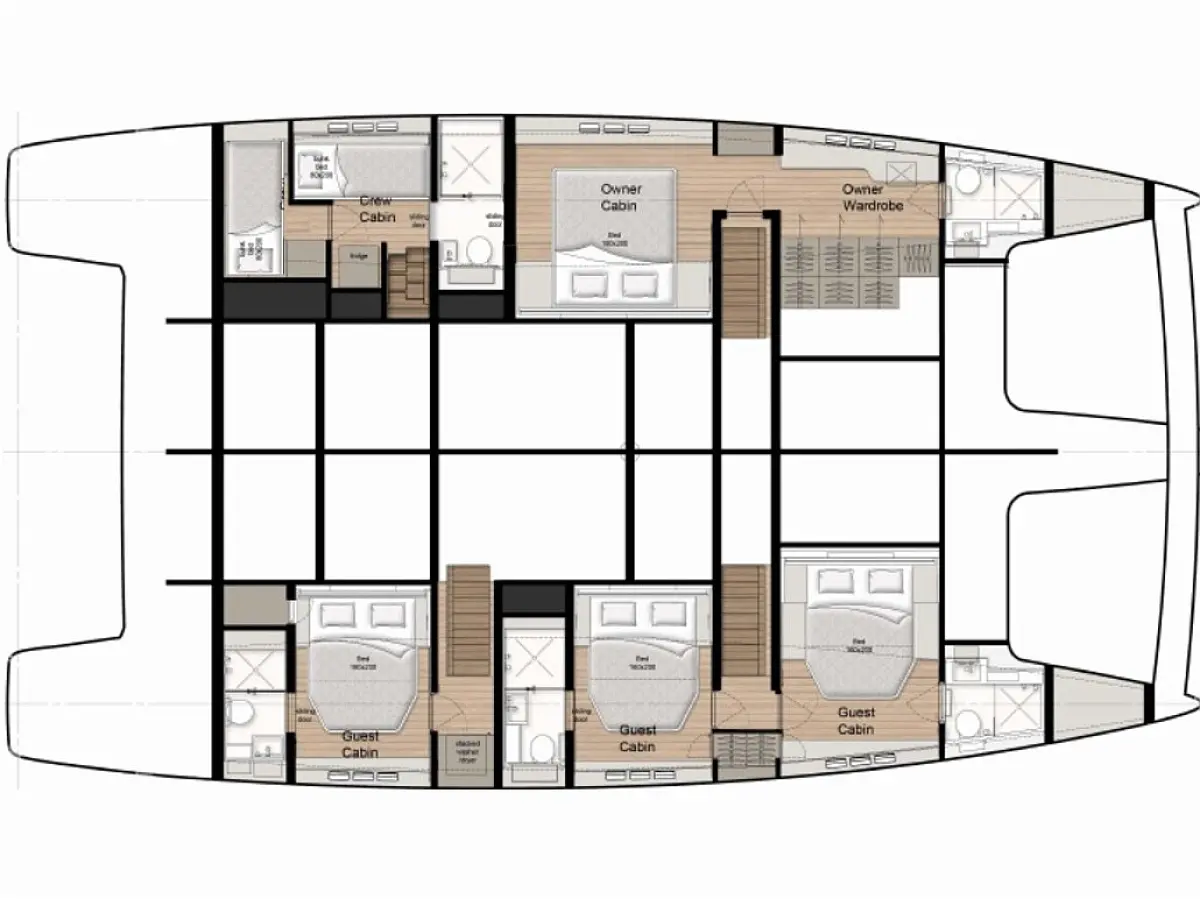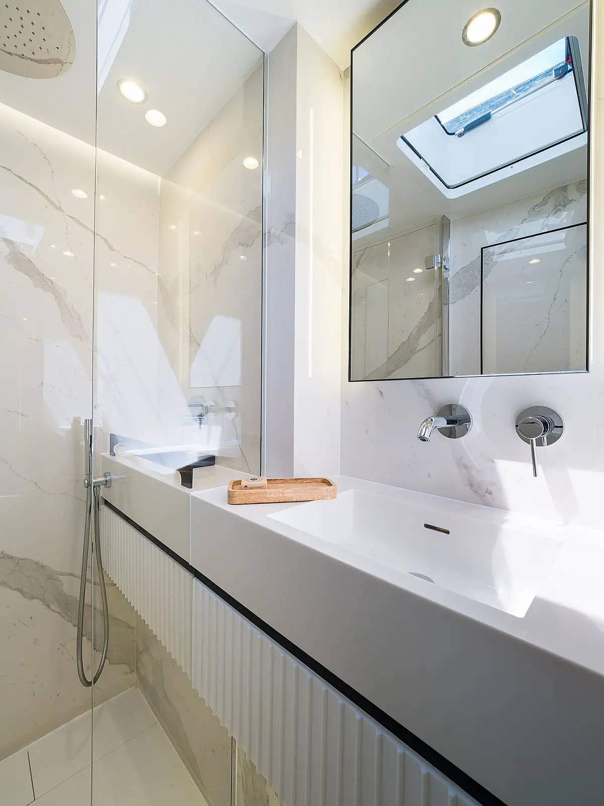 Cockpit speakers, Barbecue grill in cockpit, Air condition, Heating, Swimming platform, Bimini, Teak deck, Refrigerator, Generator, Solar Panels, Outboard engine, Dinghy, Sprayhood
