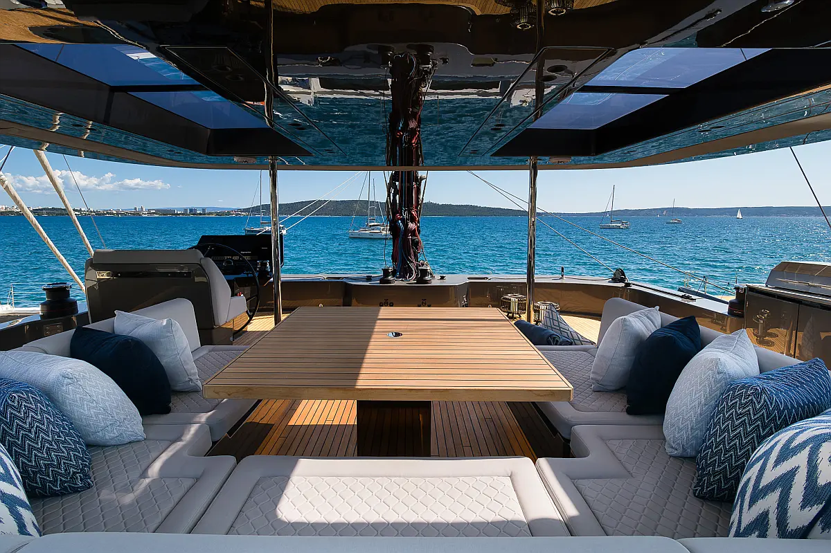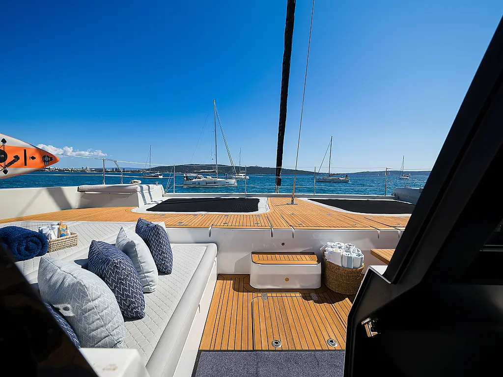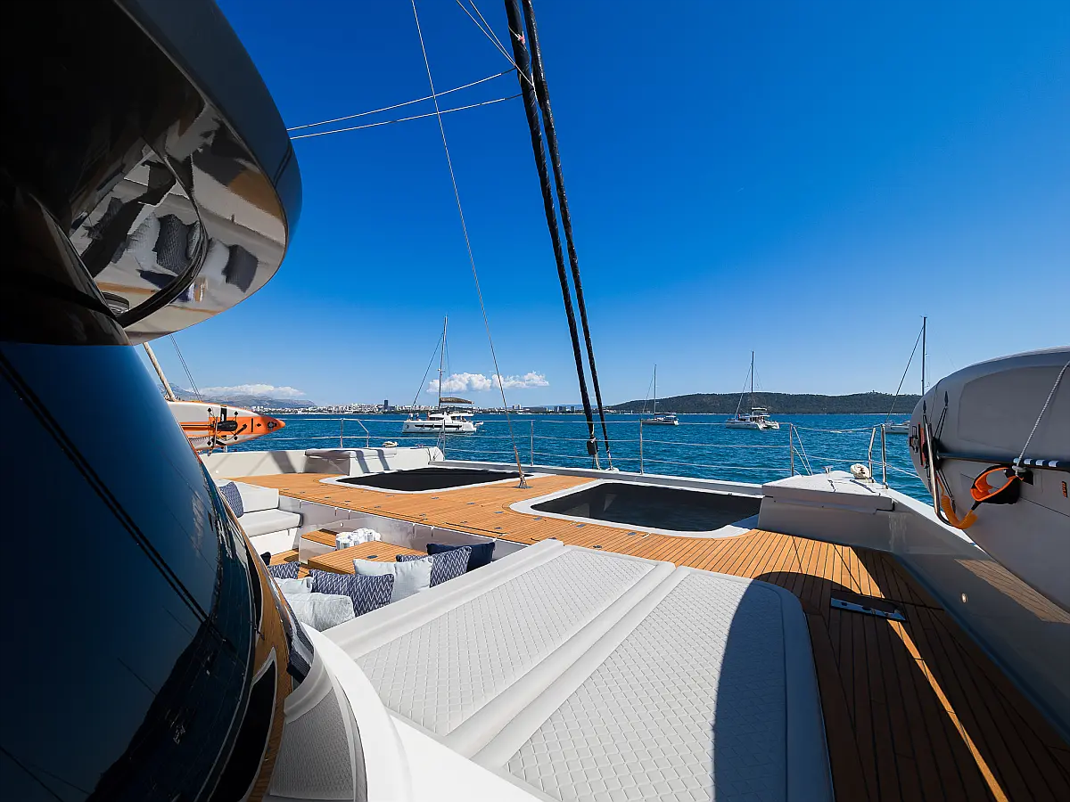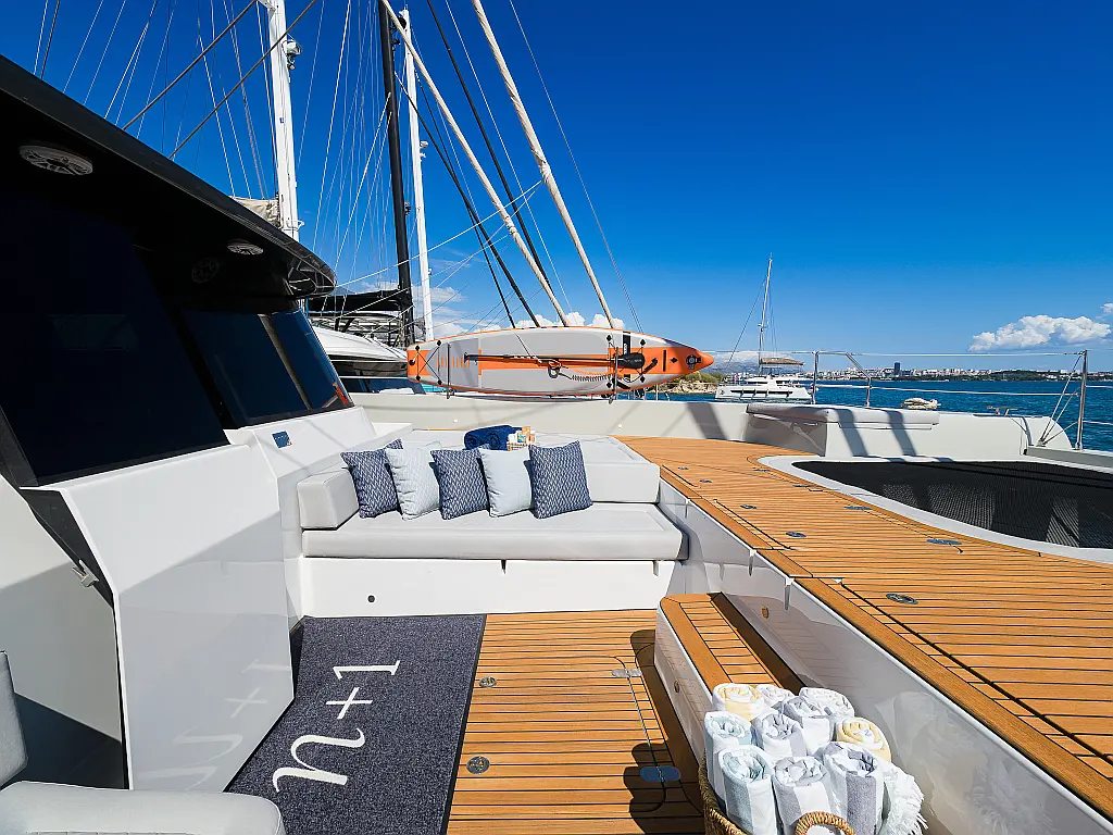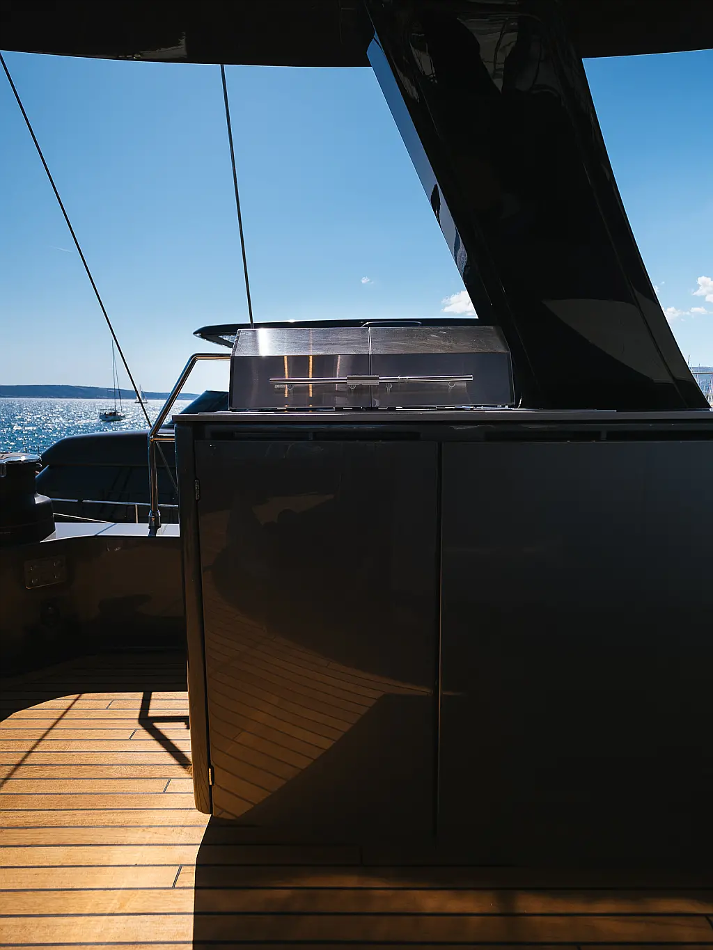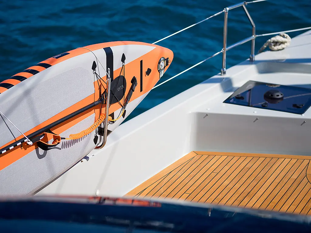 Cockpit speakers, Barbecue grill in cockpit, Air condition, Heating, Swimming platform, Bimini, Teak deck, Refrigerator, Generator, Solar Panels, Dinghy, Sprayhood
