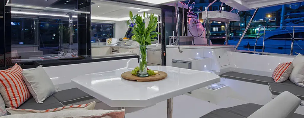 Refrigerator, Bimini, Air condition, Cockpit speakers, Cockpit cushions, Generator, Solar Panels, Electric toilet, Water maker