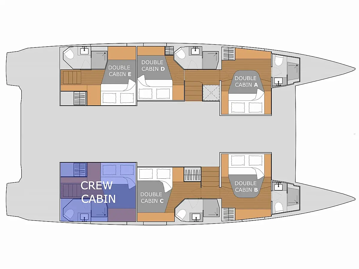 6 (5 double for guests + 1 separate crew quarters) Cabins