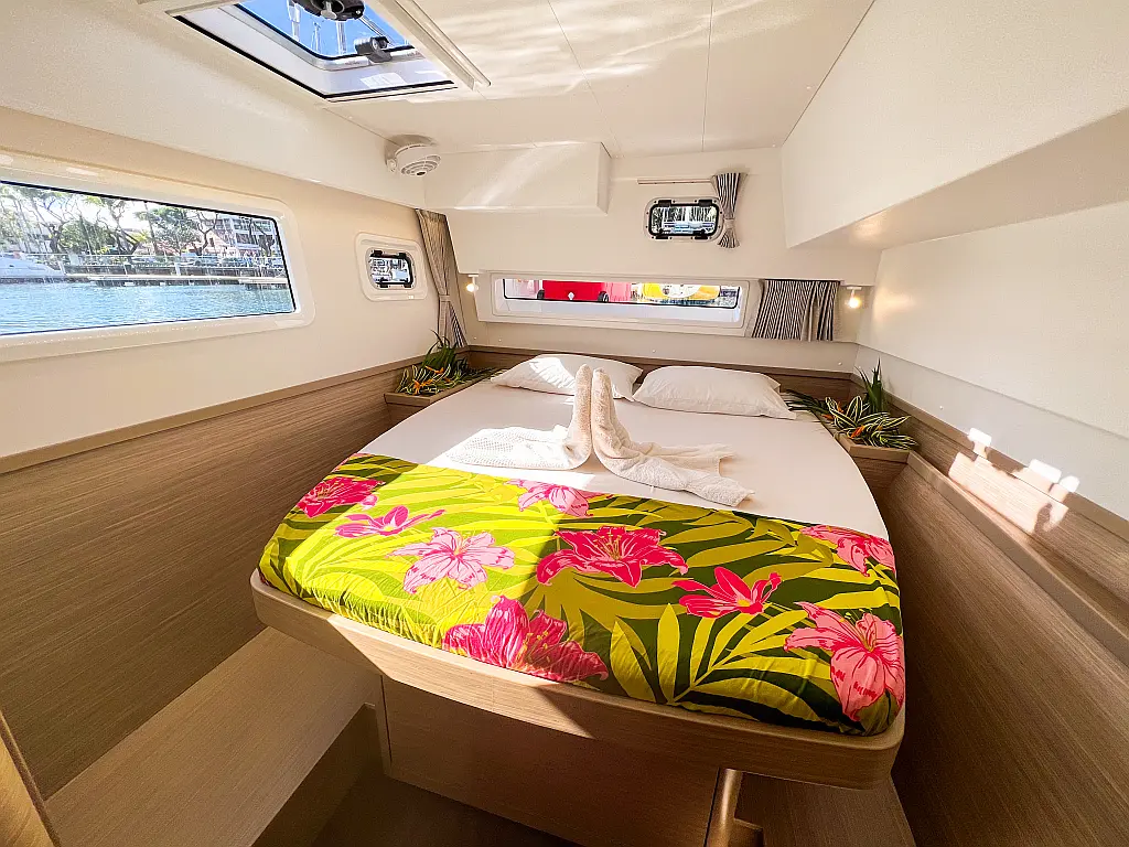 Barbecue grill in cockpit, Bimini, Cockpit cushions, Outboard engine, Refrigerator, Solar Panels, Water maker
