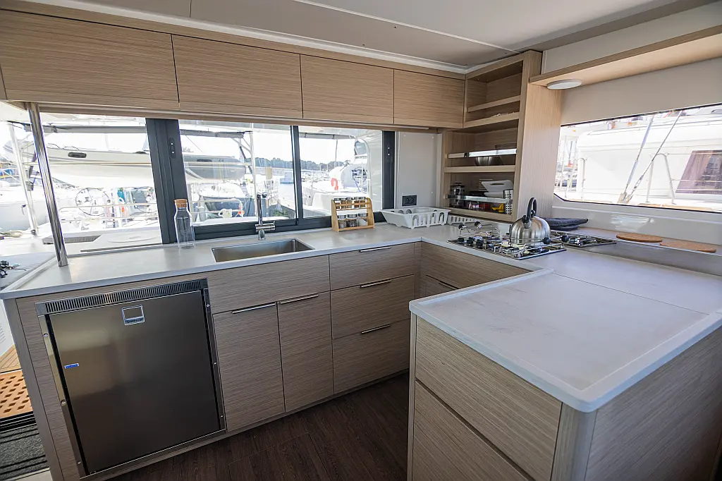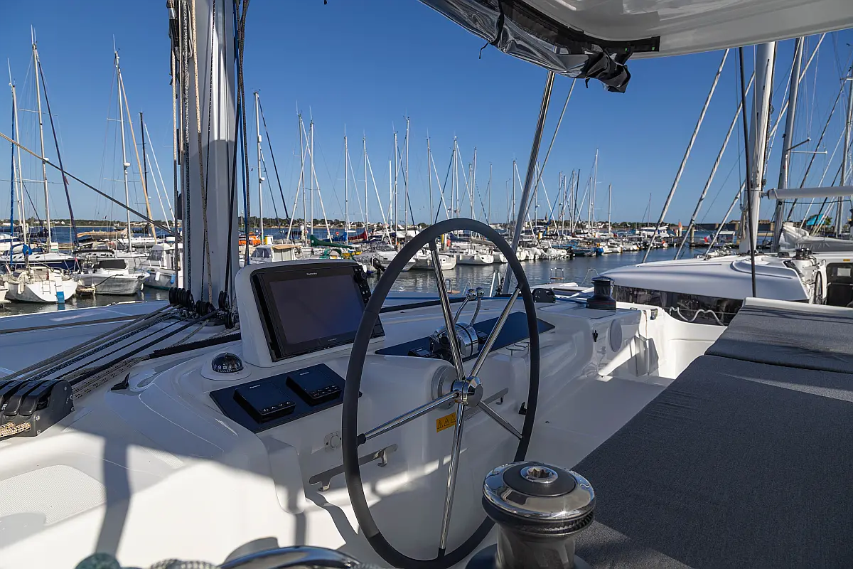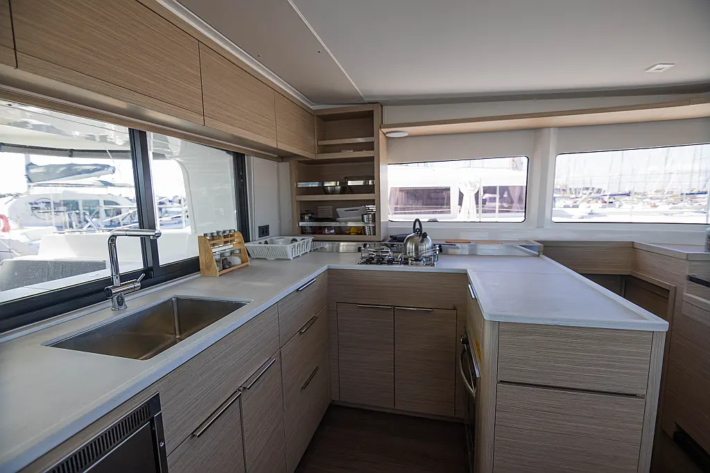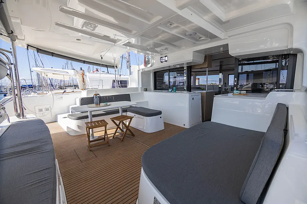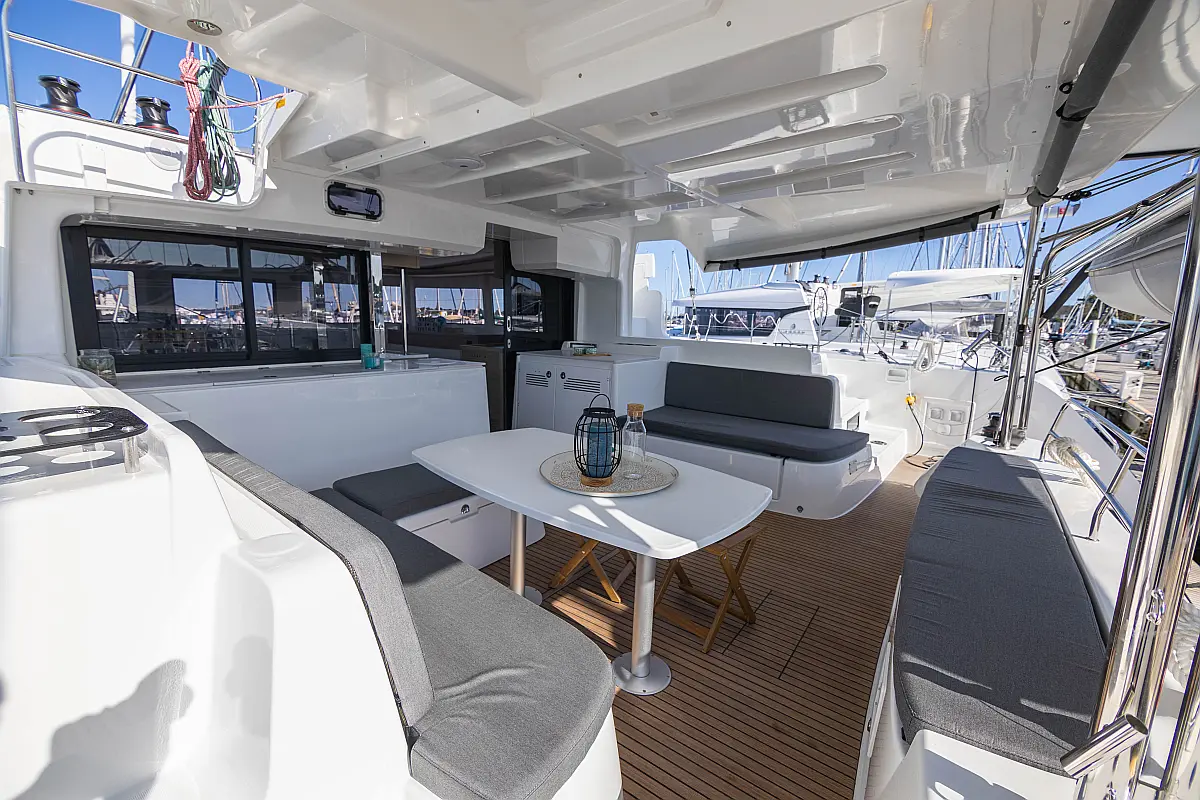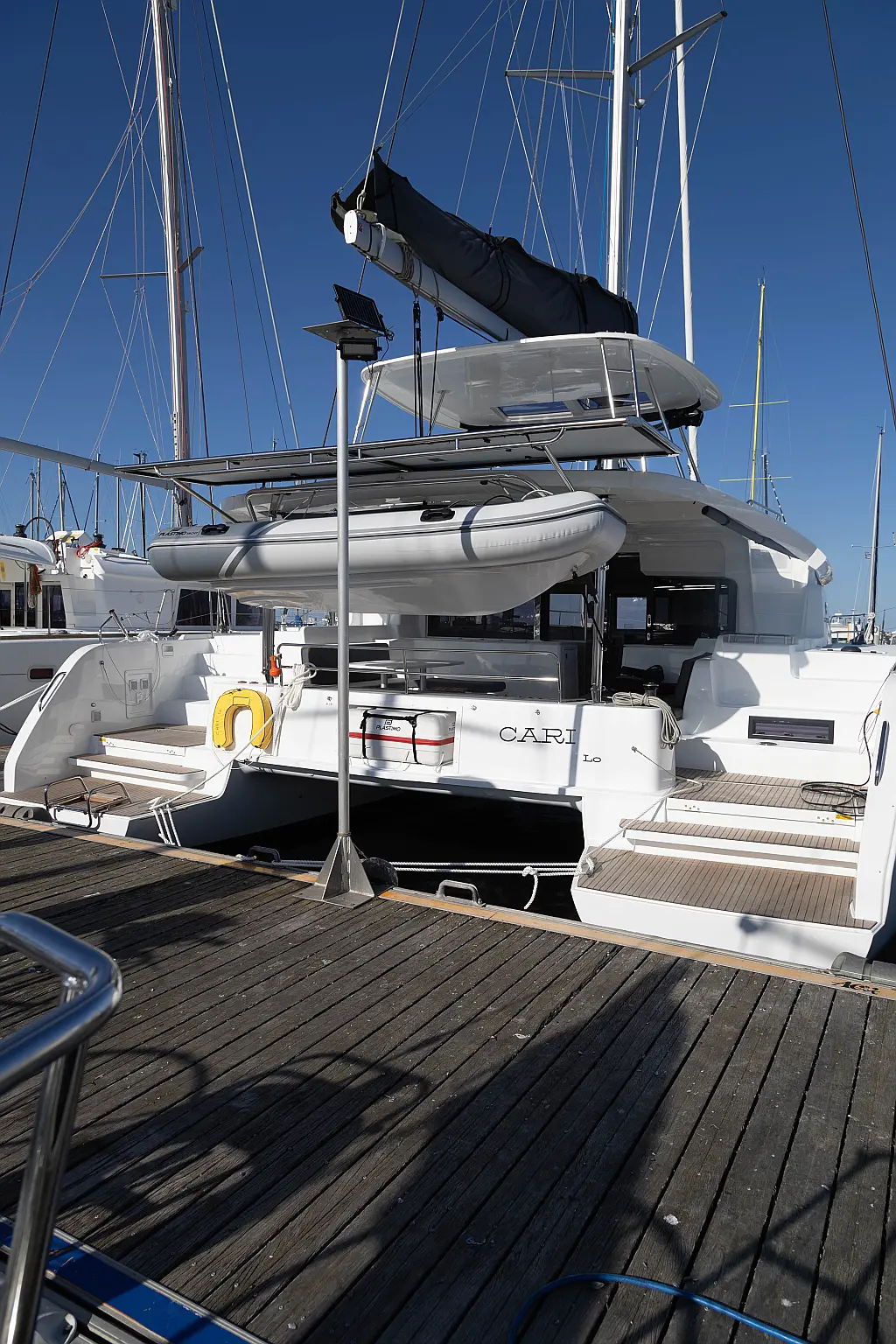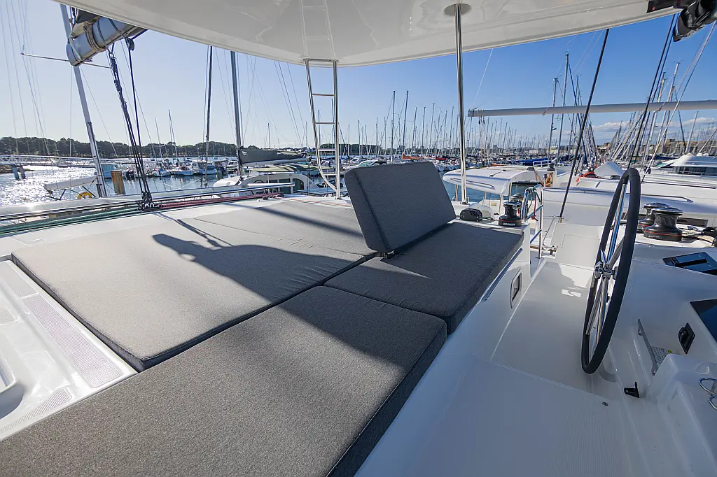 Refrigerator, Water maker, Bimini, Cockpit speakers, Dinghy, Outboard engine, Flybridge, Teak deck, Inverter, Solar Panels